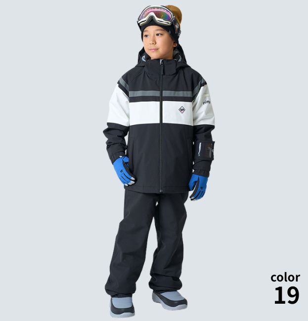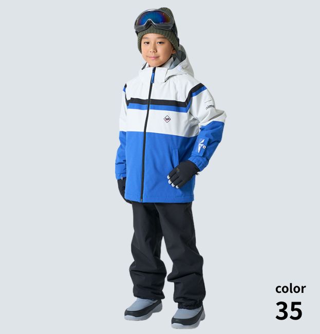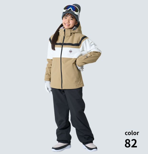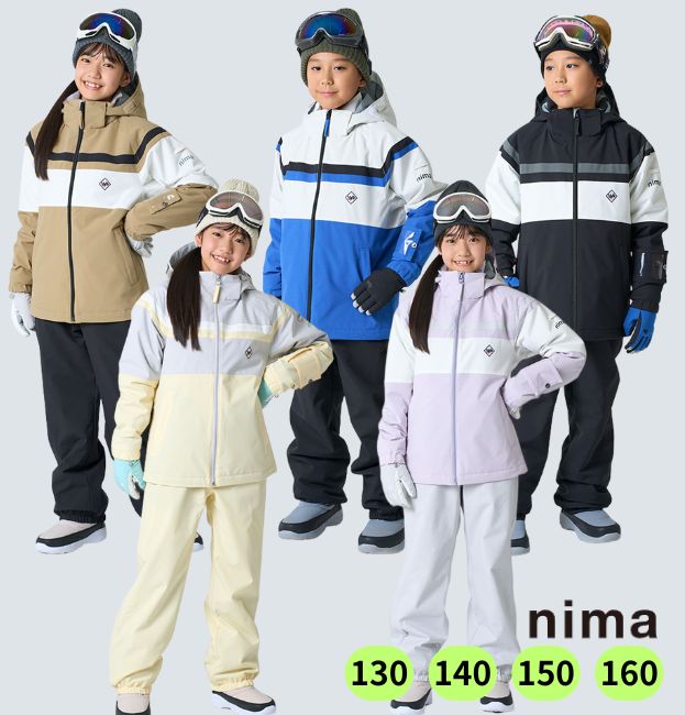 NIMAのキッズ用スノーボードウェア上下セットは、耐水圧10,000mmの高機能素材「MINI OX」を採用し、雪や水の侵入をしっかりガード。