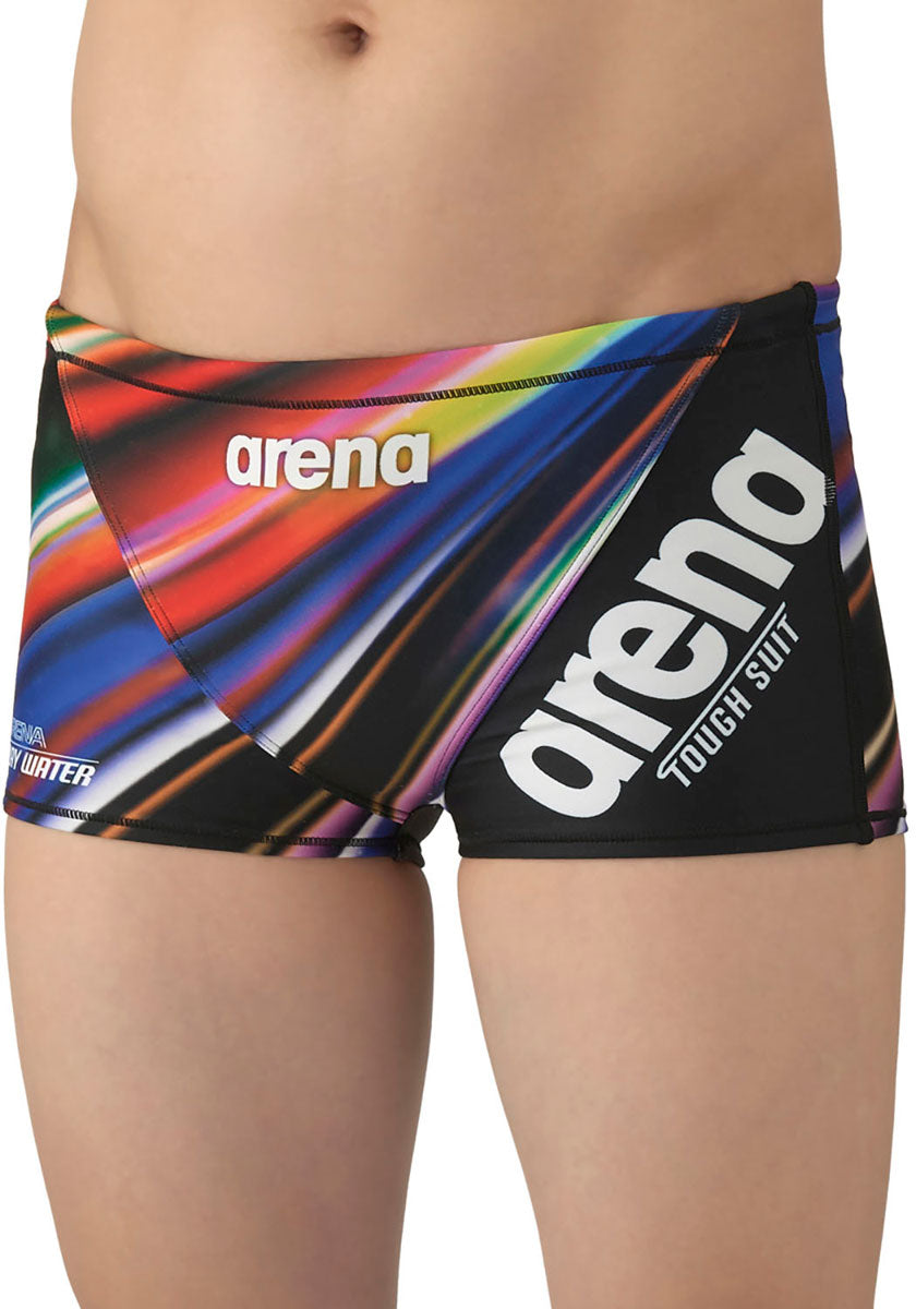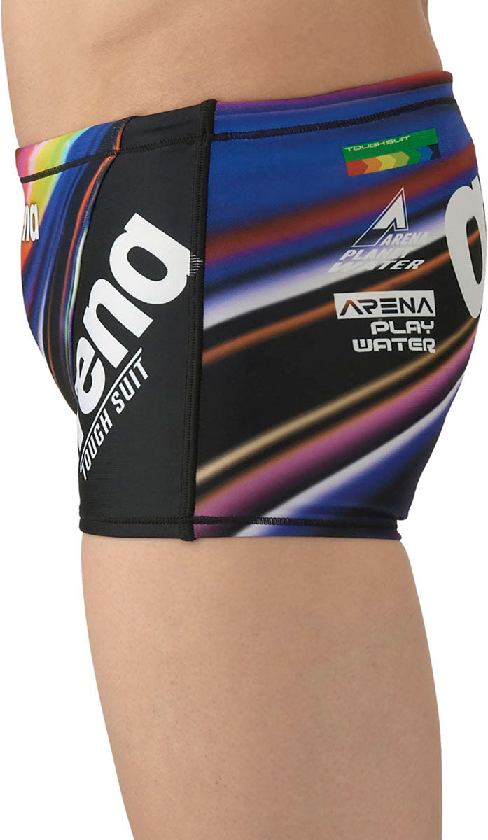トレーニングカテゴリー「TOUGHSUITシリーズ」。大会に向けて練習を重ねる頻度が高いスイマーにオススメの練習用水着。環境に配慮したリサイクルポリエステル素材「タフスキンT2E」を使用し塩素に強く長持ち。アリーナロゴが左腿に配置されたデザインの練習水着。スタイリッシュでカッコいいデザインから可愛くトレンド感があるデザインまで、幅広くバリエーションに富んだスタイルを一つの品番で表現。BKBL:地球や宇宙の光と自然の色彩の美しさから着想を得たデザイン。NVWH:パイナップルのモチーフを大胆に使用したカジュアルでトレンド感のあるデザイン。BKPP:アリーナロゴの中にきらめく光の柄を入れたシンプルながらもスタイリッシュな印象を与えるデザイン。PPBK:地球や水の色彩の美しさから着想を得たクールなデザイン。前身頃、後身頃に黒の裏地付き。ショートレッグタイプ。