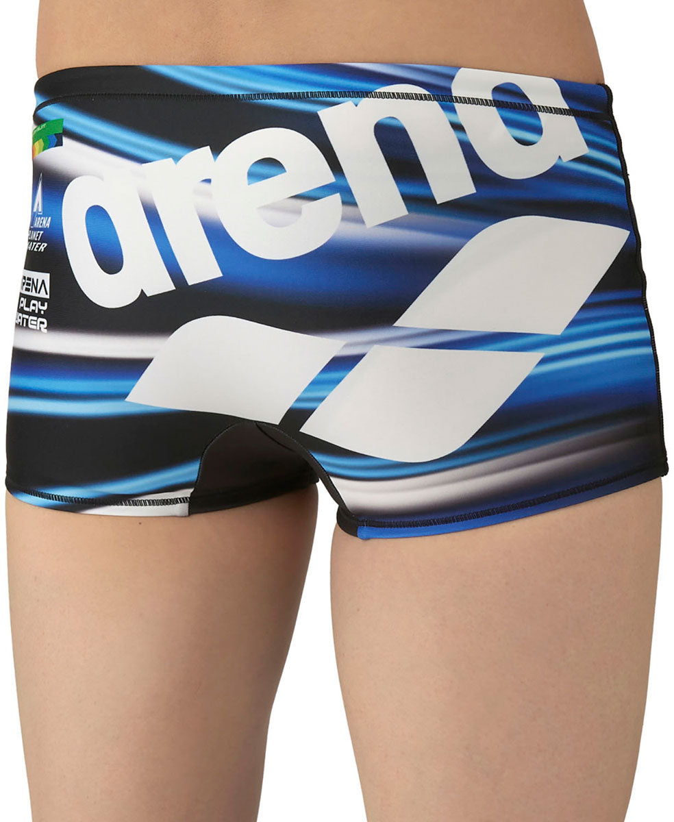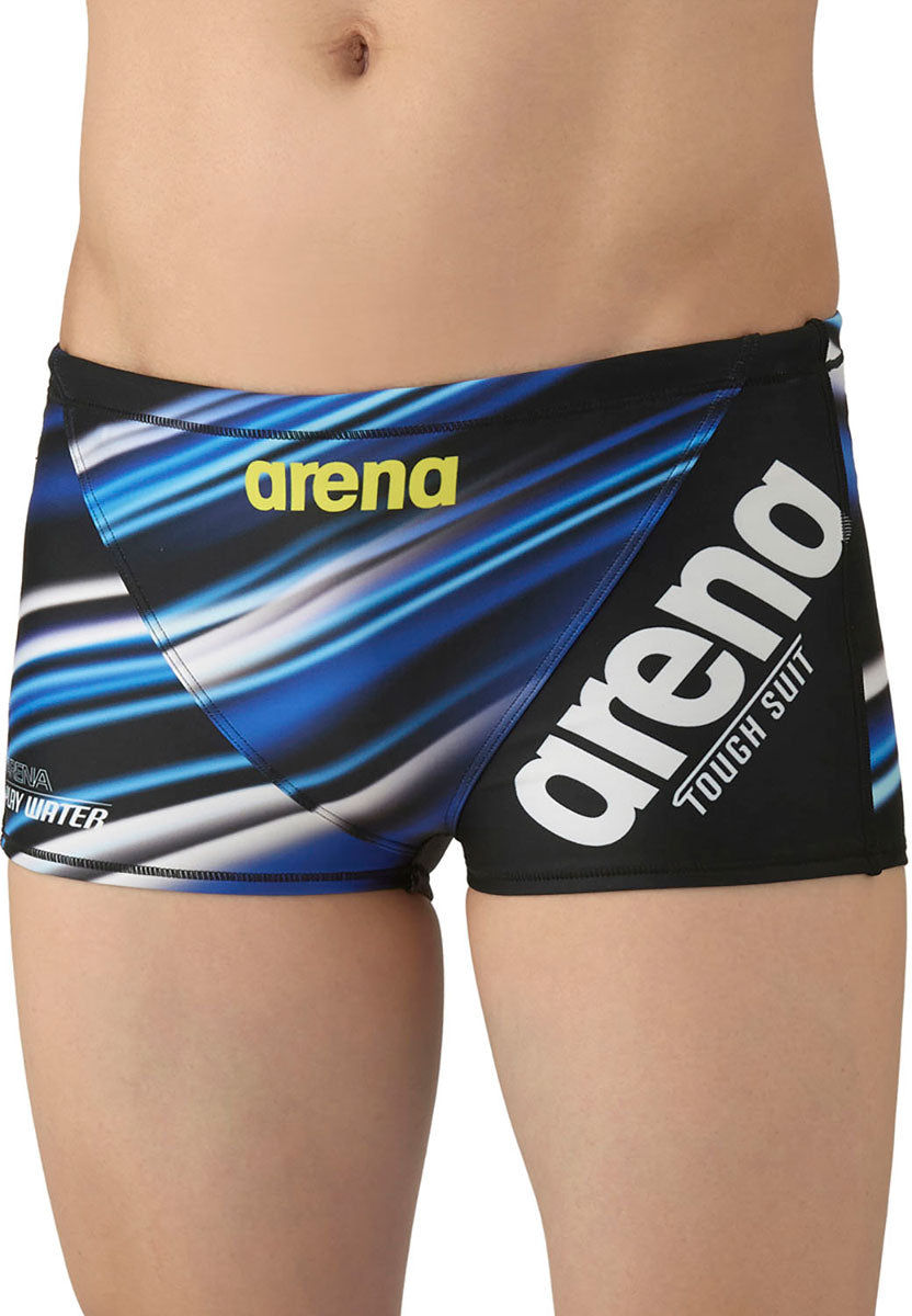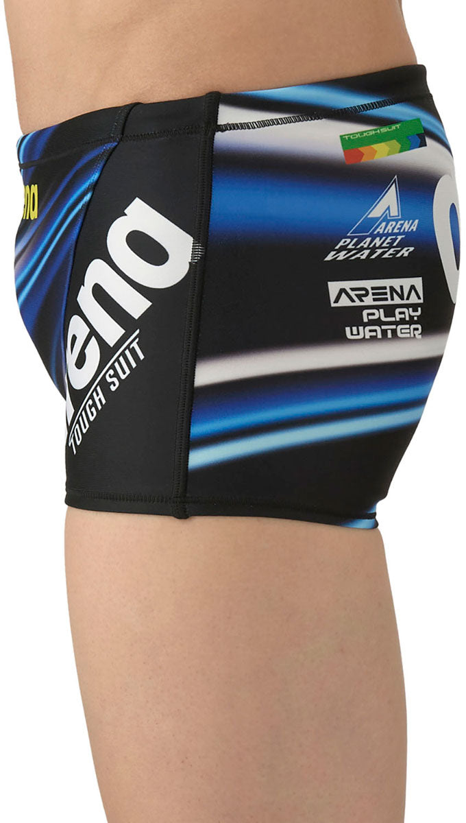 トレーニングカテゴリー「TOUGHSUITシリーズ」。大会に向けて練習を重ねる頻度が高いスイマーにオススメの練習用水着。環境に配慮したリサイクルポリエステル素材「タフスキンT2E」を使用し塩素に強く長持ち。アリーナロゴが左腿に配置されたデザインの練習水着。スタイリッシュでカッコいいデザインから可愛くトレンド感があるデザインまで、幅広くバリエーションに富んだスタイルを一つの品番で表現。BKBL:地球や宇宙の光と自然の色彩の美しさから着想を得たデザイン。NVWH:パイナップルのモチーフを大胆に使用したカジュアルでトレンド感のあるデザイン。BKPP:アリーナロゴの中にきらめく光の柄を入れたシンプルながらもスタイリッシュな印象を与えるデザイン。PPBK:地球や水の色彩の美しさから着想を得たクールなデザイン。前身頃、後身頃に黒の裏地付き。ショートレッグタイプ。