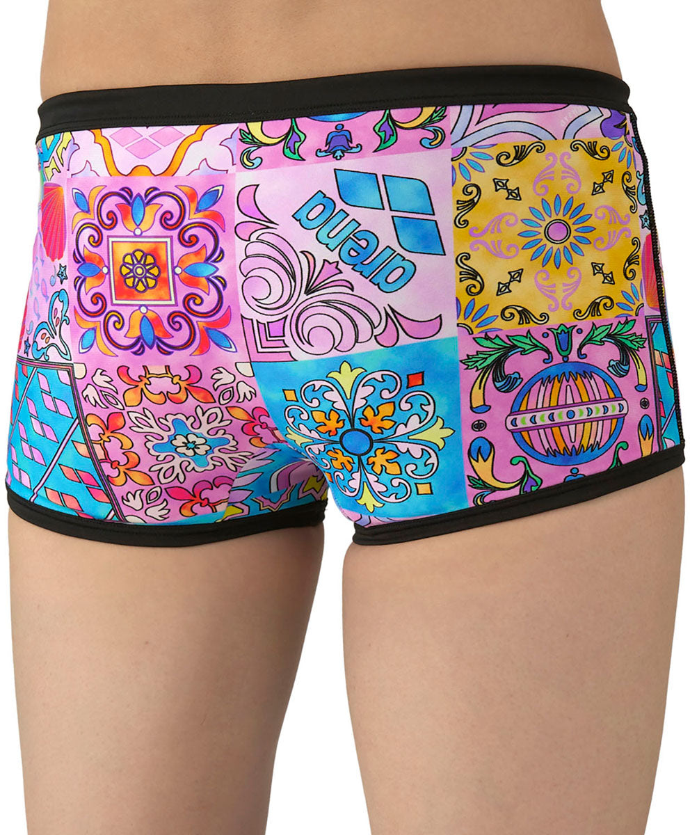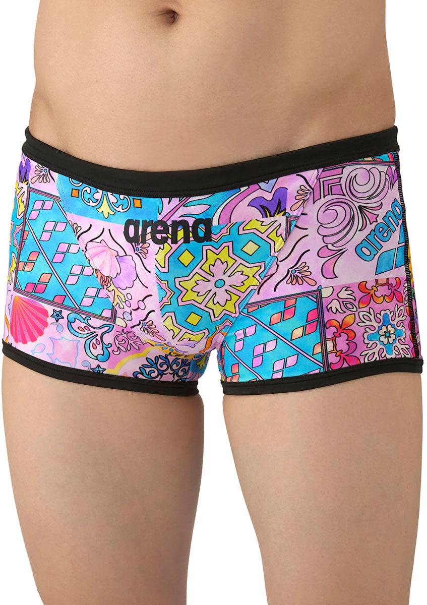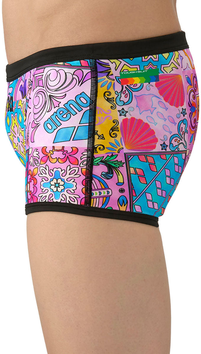 トレーニングカテゴリー「TOUGHSUITシリーズ」。大会に向けて練習を重ねる頻度が高いスイマーにオススメの練習用水着。環境に配慮したリサイクルポリエステル素材「タフスキンT2E」を使用し塩素に強く長持ち。シーズンテーマのFUSION COLORSの総柄ショートレッグタイプ。シンガポールの多民族・多文化の共存と相互尊重によって生み出されたプラナカン文化をオマージュし、豊かな色彩が特徴的な人種や文化の交わりをカラフルな4配色で表現。プラナカン建築の装飾に用いられるプラナカンタイルと呼ばれる、花や果物、鳥などを多彩に色付けしたレリーフ調のタイルをモチーフに採用。プラナカンの伝統的な美しい模様を現代のスタイルとアリーナのロゴやチームライン、水と親和性のあるモチーフを融合させ、アリーナオリジナルの柄を作成。鮮やかな色合いと繊細なディティールが特徴で視覚的に豊かでありながらクラシックな雰囲気を表現。前身頃、後身頃共に黒の裏地付き。※この商品は縫製上、一点一点プリント柄の見え方に違いが生じますので予めご了承ください。