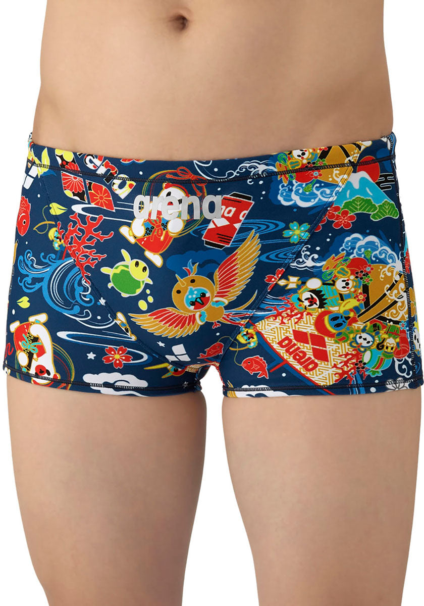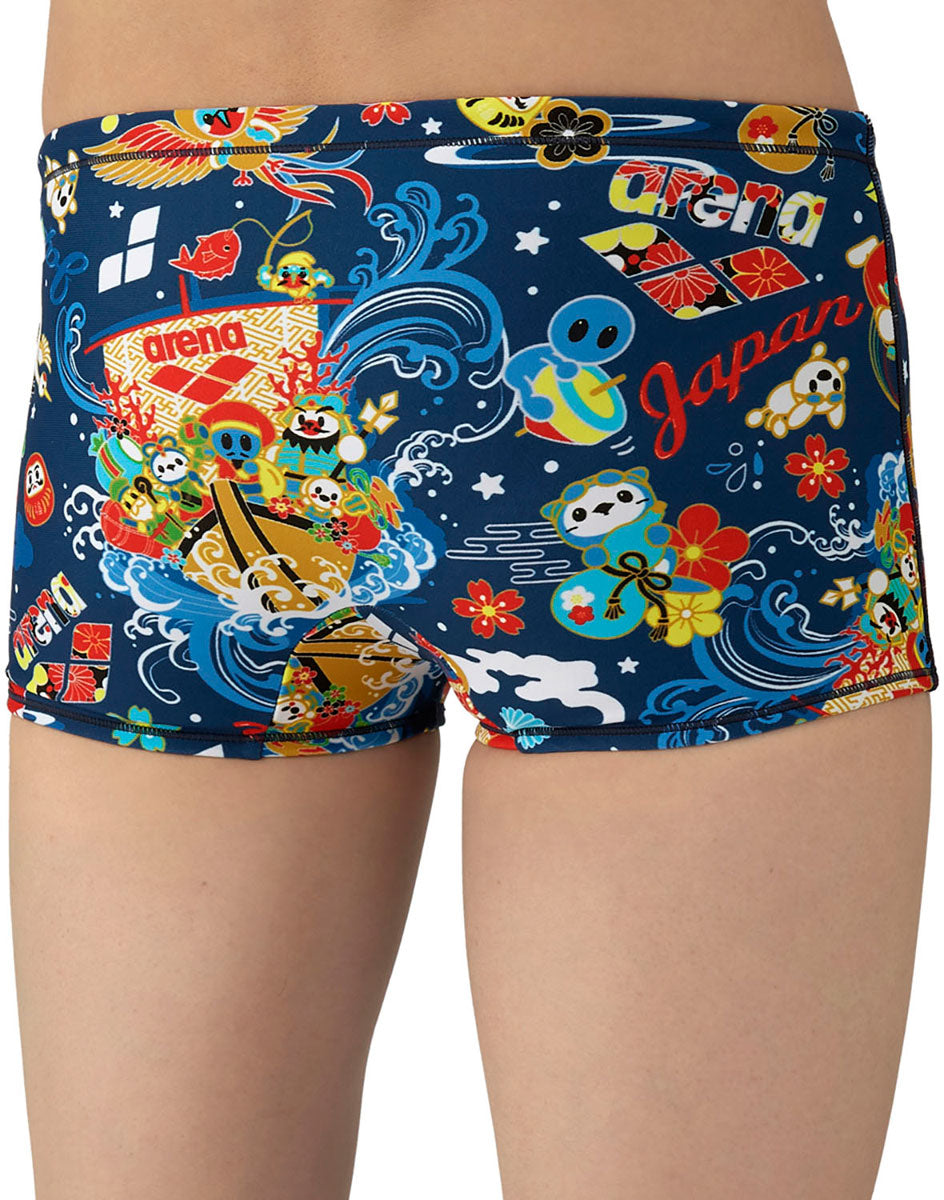 トレーニングカテゴリー「TOUGHSUITシリーズ」。大会に向けて練習を重ねる頻度が高いスイマーにオススメの練習用水着。環境に配慮したリサイクルポリエステル素材「タフスキンEP」を使用し塩素に強く長持ち。全てのスイマーに人気のアリーナくんの総柄ショートレッグタイプ。日本の縁起の良い和柄と海と親和性のある宝船がポイント。宝船が象徴する繁栄や幸運が着用するスイマーたちへ届くよう願いを込めたデザイン。アリーナくんと仲間たちが七福神になっている遊び心を表現。前身頃、後身頃共に黒の裏地付き。※この商品は縫製上、一点一点プリント柄の見え方に違いが生じますので予めご了承ください。
