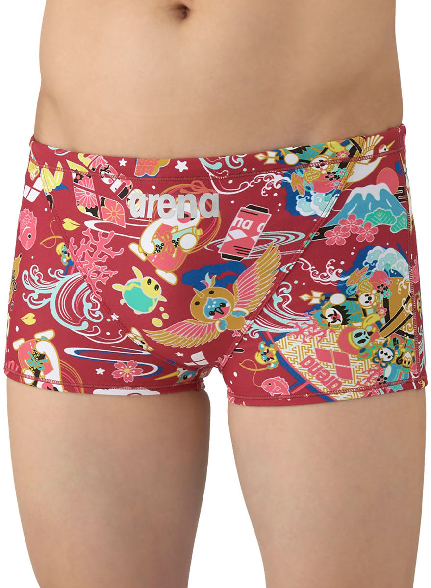 トレーニングカテゴリー「TOUGHSUITシリーズ」。大会に向けて練習を重ねる頻度が高いスイマーにオススメの練習用水着。環境に配慮したリサイクルポリエステル素材「タフスキンEP」を使用し塩素に強く長持ち。全てのスイマーに人気のアリーナくんの総柄ショートレッグタイプ。日本の縁起の良い和柄と海と親和性のある宝船がポイント。宝船が象徴する繁栄や幸運が着用するスイマーたちへ届くよう願いを込めたデザイン。アリーナくんと仲間たちが七福神になっている遊び心を表現。前身頃、後身頃共に黒の裏地付き。※この商品は縫製上、一点一点プリント柄の見え方に違いが生じますので予めご了承ください。