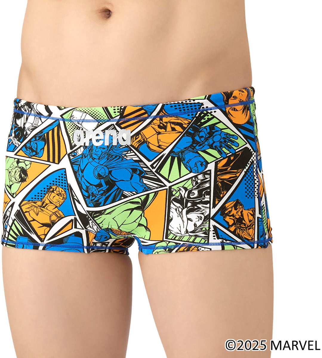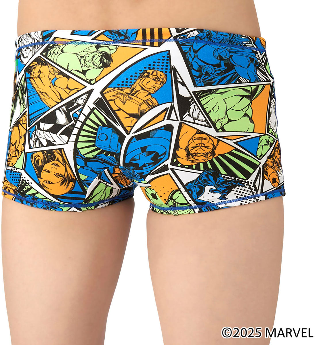 耐久性に優れたTOUGHSUIT(タフスーツ)シリーズの MARVEL(マーベル)デザインモデル。環境に配慮したリサイクルポリエステル素材を使用しており、塩素に強く長持ちするため、大会に向けて練習を重ねる頻度が高いスイマーにおすすめのトレーニング(練習)用水着。25FW は、アイアンマン/ソー/ブラック・ウィドウ/キャプテン・アメリカ/ハルク/ブラックパンサー と、MARVEL(マーベル)を代表するヒーローたちがアメリカンコミック調に表現されたプリントデザイン。ポップなカラーリングでトレーニングを楽しもう!水着とデザイン連動のメッシュキャップ(AS5FSC80U)やプルーフバッグ(AS5FBZ83U)とのコーディネートもおすすめ。※この製品は縫製上、一点一点プリント柄の見え方に違いが生じますので予めご了承ください。