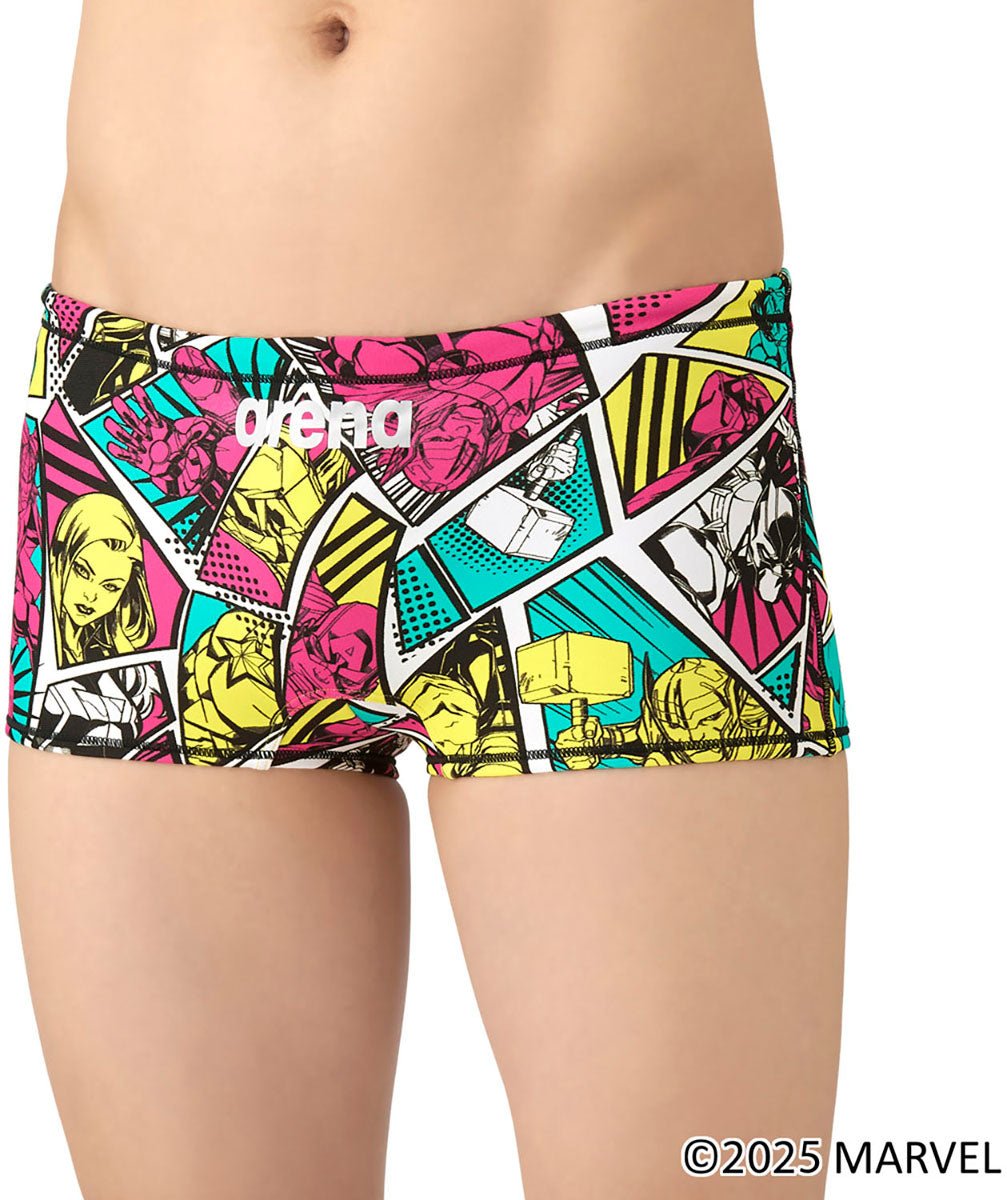 耐久性に優れたTOUGHSUIT(タフスーツ)シリーズの MARVEL(マーベル)デザインモデル。環境に配慮したリサイクルポリエステル素材を使用しており、塩素に強く長持ちするため、大会に向けて練習を重ねる頻度が高いスイマーにおすすめのトレーニング(練習)用水着。25FW は、アイアンマン/ソー/ブラック・ウィドウ/キャプテン・アメリカ/ハルク/ブラックパンサー と、MARVEL(マーベル)を代表するヒーローたちがアメリカンコミック調に表現されたプリントデザイン。ポップなカラーリングでトレーニングを楽しもう!水着とデザイン連動のメッシュキャップ(AS5FSC80U)やプルーフバッグ(AS5FBZ83U)とのコーディネートもおすすめ。※この製品は縫製上、一点一点プリント柄の見え方に違いが生じますので予めご了承ください。