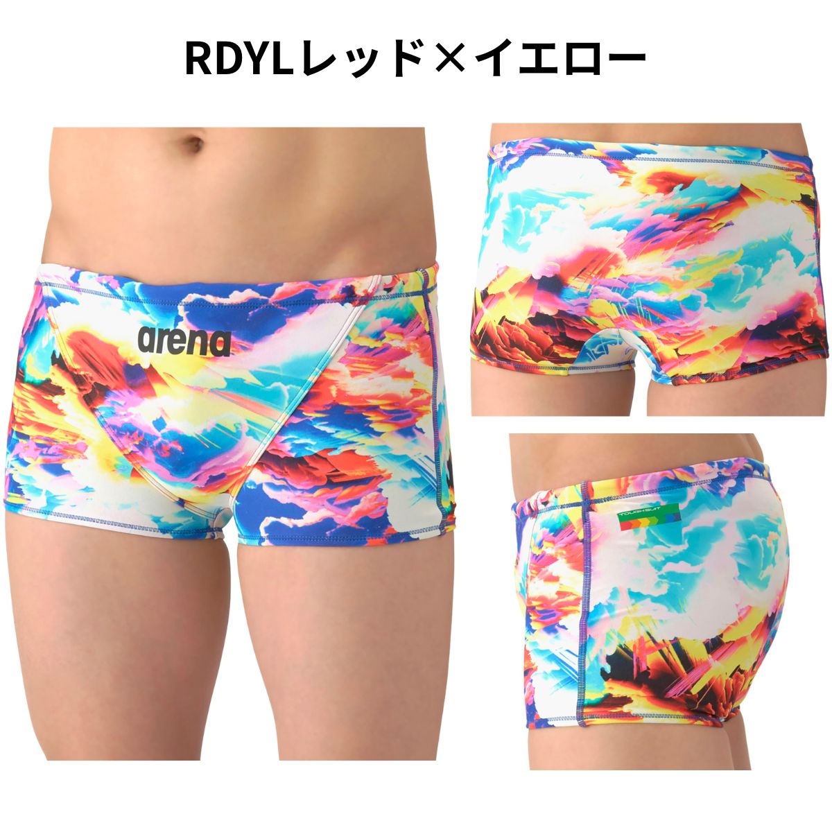 トレーニングカテゴリー「TOUGHSUITシリーズ」。大会に向けて練習を重ねる頻度が高いスイマーにオススメの練習用水着。環境に配慮したリサイクルポリエステル素材「タフスキンEP」を使用し塩素に強く長持ち。シーズンテーマのSTORM CLOUDSのデザイン。エネルギーを蓄積した雲をイメージし、カラフルな色彩とコントラストのあるグラデーションで視覚的にインパクトのあるグラフィック。前身頃、後身頃に黒の裏地付き。ショートレッグタイプ。※この商品は縫製上、一点一点プリント柄の見え方に違いが生じますので予めご了承ください。