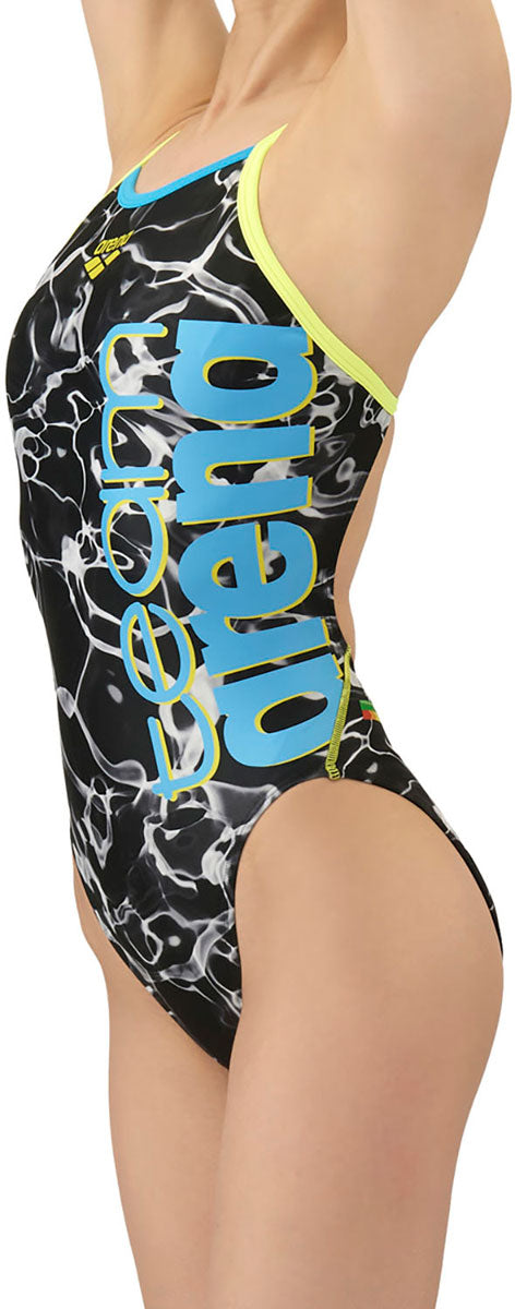 トレーニングカテゴリー「TOUGHSUITシリーズ」。大会に向けて練習を重ねる頻度が高いスイマーにオススメの練習用水着。環境に配慮したリサイクルポリエステル素材「タフスキンT2E」を使用し塩素に強く長持ち。アドバイザリー契約を締結した選手たちと共にデザインを作成した「チームアリーナコレクション」。25FWのデザインテーマは水をイメージ。水をテーマに、水に反射した光のキラキラとした自然の中の美しさを表現。水が色々なものと混ざり合い繋がり広がっていくように、アリーナとスイマーは水で繋がっているという意味を込めたデザイン。多彩な色使いと、チームアリーナロゴを大きく配置する事により、視覚的なインパクトを与えるカッコいいスタイル。成田実生選手、平井瑞希選手、鈴木聡美選手、池本凪沙選手、難波実夢選手着用。前身頃、後身頃に黒の裏地付き。ワンピースタイプ。