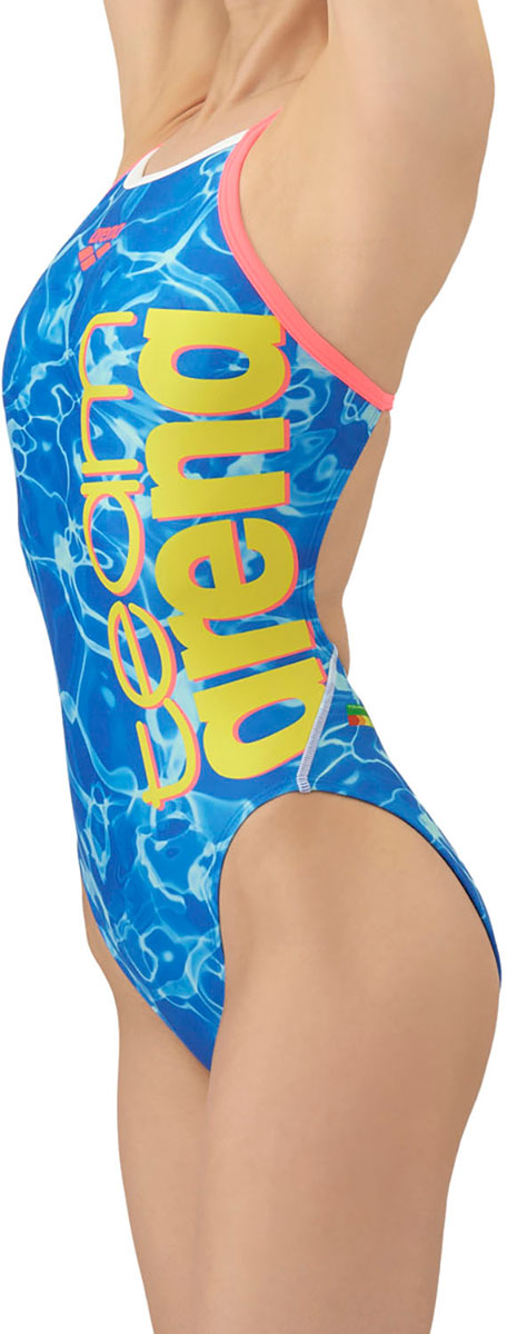 トレーニングカテゴリー「TOUGHSUITシリーズ」。大会に向けて練習を重ねる頻度が高いスイマーにオススメの練習用水着。環境に配慮したリサイクルポリエステル素材「タフスキンT2E」を使用し塩素に強く長持ち。アドバイザリー契約を締結した選手たちと共にデザインを作成した「チームアリーナコレクション」。25FWのデザインテーマは水をイメージ。水をテーマに、水に反射した光のキラキラとした自然の中の美しさを表現。水が色々なものと混ざり合い繋がり広がっていくように、アリーナとスイマーは水で繋がっているという意味を込めたデザイン。多彩な色使いと、チームアリーナロゴを大きく配置する事により、視覚的なインパクトを与えるカッコいいスタイル。成田実生選手、平井瑞希選手、鈴木聡美選手、池本凪沙選手、難波実夢選手着用。前身頃、後身頃に黒の裏地付き。ワンピースタイプ。
