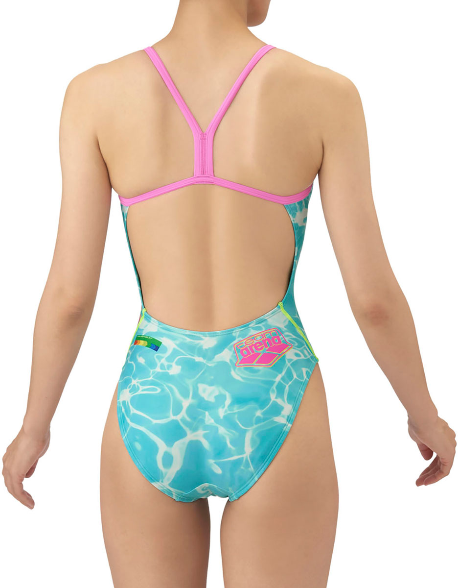 トレーニングカテゴリー「TOUGHSUITシリーズ」。大会に向けて練習を重ねる頻度が高いスイマーにオススメの練習用水着。環境に配慮したリサイクルポリエステル素材「タフスキンT2E」を使用し塩素に強く長持ち。アドバイザリー契約を締結した選手たちと共にデザインを作成した「チームアリーナコレクション」。25FWのデザインテーマは水をイメージ。水をテーマに、水に反射した光のキラキラとした自然の中の美しさを表現。水が色々なものと混ざり合い繋がり広がっていくように、アリーナとスイマーは水で繋がっているという意味を込めたデザイン。多彩な色使いと、チームアリーナロゴを大きく配置する事により、視覚的なインパクトを与えるカッコいいスタイル。成田実生選手、平井瑞希選手、鈴木聡美選手、池本凪沙選手、難波実夢選手着用。前身頃、後身頃に黒の裏地付き。ワンピースタイプ。