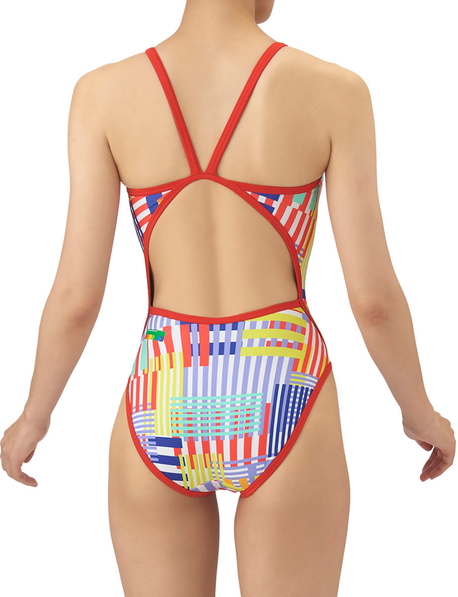 トレーニングカテゴリー「TOUGHSUITシリーズ」。大会に向けて練習を重ねる頻度が高いスイマーにオススメの練習用水着。環境に配慮したリサイクルポリエステル素材「タフスキンEP」を使用し塩素に強く長持ち。シーズンテーマのFUSION COLORSの総柄ワンピースタイプ。シンガポールの多民族・多文化の共存と相互尊重によって生み出されたプラナカン文化をオマージュし、豊かな色彩が特徴的な人種や文化の交わりをカラフルな3配色で表現。チェック柄、カラフル、可愛いの要素を組み合わせて、色鮮やかな配色が活発で元気なイメージを強調するデザイン。前身頃、後身頃共に黒の裏地付き。※この商品は縫製上、一点一点プリント柄の見え方に違いが生じますので予めご了承ください。