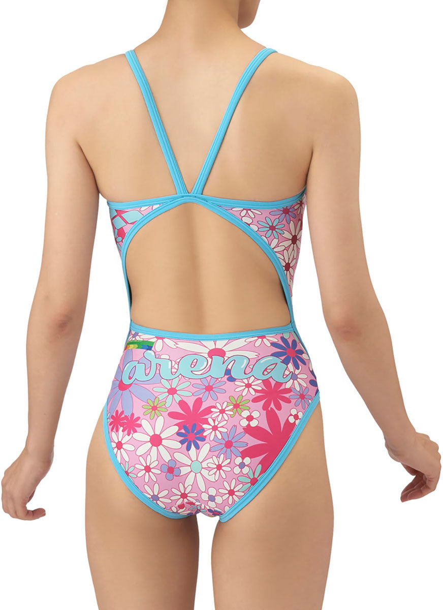 トレーニングカテゴリー「TOUGHSUITシリーズ」。大会に向けて練習を重ねる頻度が高いスイマーにオススメの練習用水着。環境に配慮したリサイクルポリエステル素材「タフスキンT2E」を使用し塩素に強く長持ち。アリーナロゴが脇に配置されたデザインの練習水着。スタイリッシュでカッコいいデザインから可愛くトレンド感があるデザインまで、幅広くバリエーションに富んだスタイルを一つの品番で表現。BKPK:地球や宇宙の光と自然の色彩の美しさから着想を得たデザイン。BKRD:チェリーのモチーフを使ったフルーティーで明るい印象を与えるデザイン。PKBL:レトロな花柄をトレンド感のある配色やロゴと組み合わせたデザインで表現。PPBK:輝く光と可愛いロゴがトレンド感と明るい印象を与えるデザイン。前身頃、後身頃に黒の裏地付き。ワンピースタイプ。