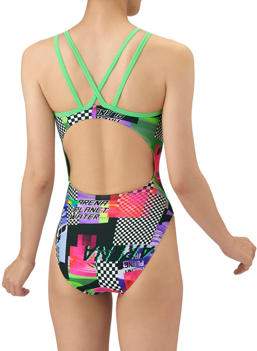 トレーニングカテゴリー「TOUGHSUITシリーズ」。大会に向けて練習を重ねる頻度が高いスイマーにオススメの練習用水着。環境に配慮したリサイクルポリエステル素材「タフスキンT2E」を使用し塩素に強く長持ち。肩紐をダブルストラップにすることで1点にかかる圧を2点に分散させ、肩に感じる負担を減らし、よりよい着心地を実現(※アリーナダブルストラップ理論)。ランダムな色の変化やエフェクトが生み出す動きのあるグリッチアート柄を取り入れたスタイル。デジタル感とレトロな要素を融合させたデザイン。前身頃に黒の裏地付き。ワンピースタイプ。※この商品は縫製上、一点一点プリント柄の見え方に違いが生じますので予めご了承ください。