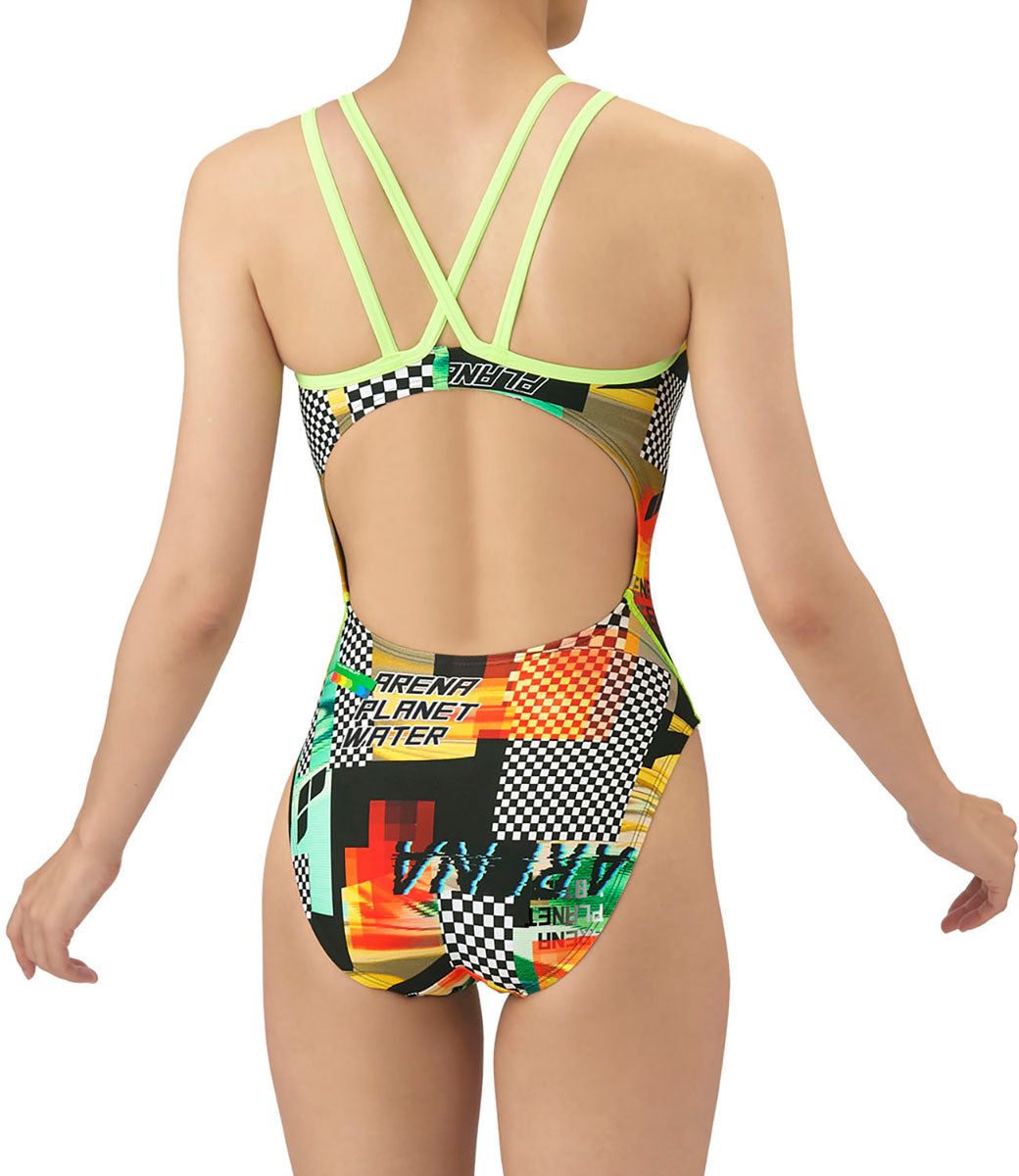 トレーニングカテゴリー「TOUGHSUITシリーズ」。大会に向けて練習を重ねる頻度が高いスイマーにオススメの練習用水着。環境に配慮したリサイクルポリエステル素材「タフスキンT2E」を使用し塩素に強く長持ち。肩紐をダブルストラップにすることで1点にかかる圧を2点に分散させ、肩に感じる負担を減らし、よりよい着心地を実現(※アリーナダブルストラップ理論)。ランダムな色の変化やエフェクトが生み出す動きのあるグリッチアート柄を取り入れたスタイル。デジタル感とレトロな要素を融合させたデザイン。前身頃に黒の裏地付き。ワンピースタイプ。※この商品は縫製上、一点一点プリント柄の見え方に違いが生じますので予めご了承ください。