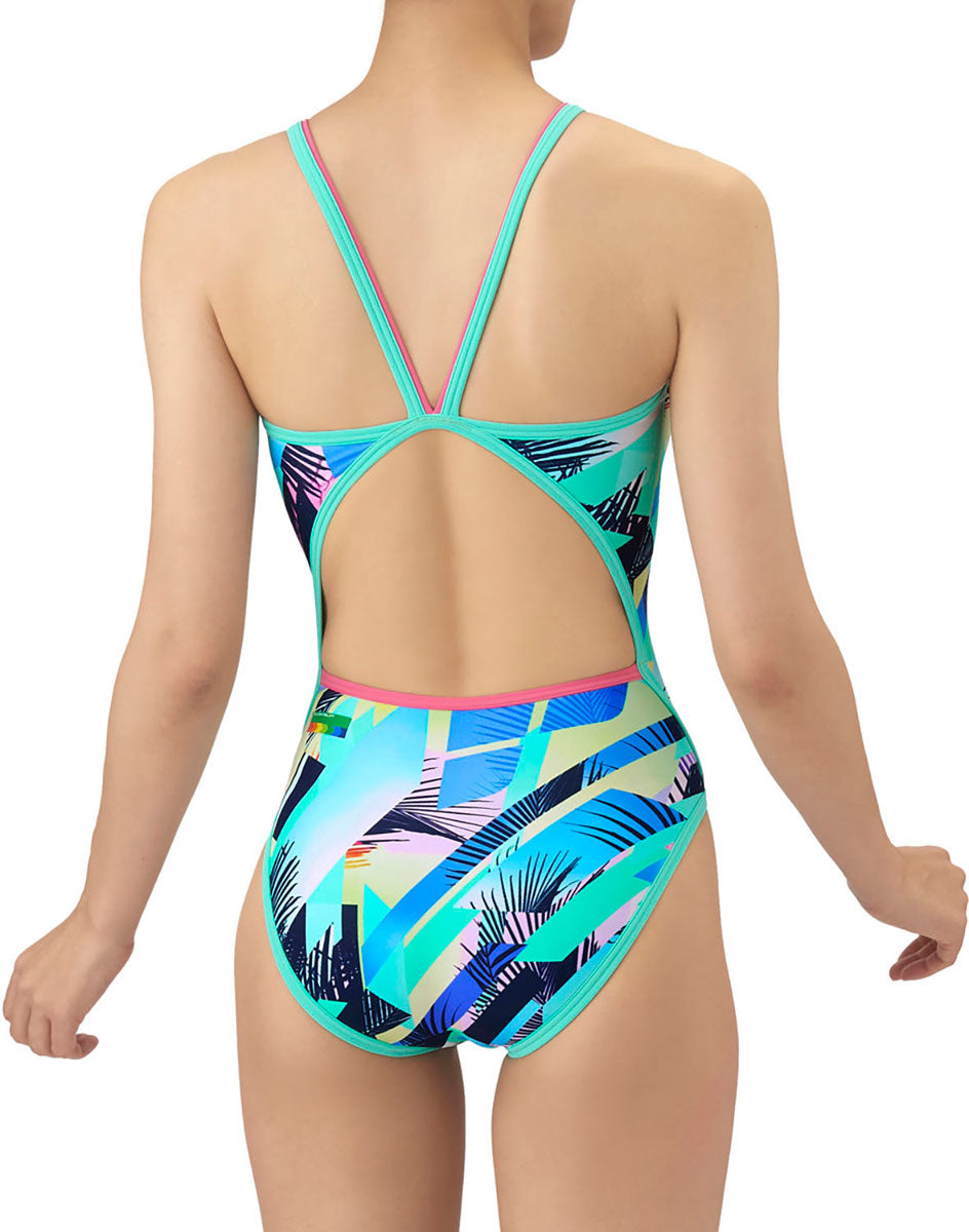 トレーニングカテゴリー「TOUGHSUITシリーズ」。大会に向けて練習を重ねる頻度が高いスイマーにオススメの練習用水着。環境に配慮したリサイクルポリエステル素材「タフスキンEP」を使用し塩素に強く長持ち。自然の美しさからインスピレーションを得たリーフ柄と現代的で洗練された印象を与える幾何学柄を組み合わせたデザイン。前身頃、後身頃に黒の裏地付き。ワンピースタイプ。※この商品は縫製上、一点一点プリント柄の見え方に違いが生じますので予めご了承ください。