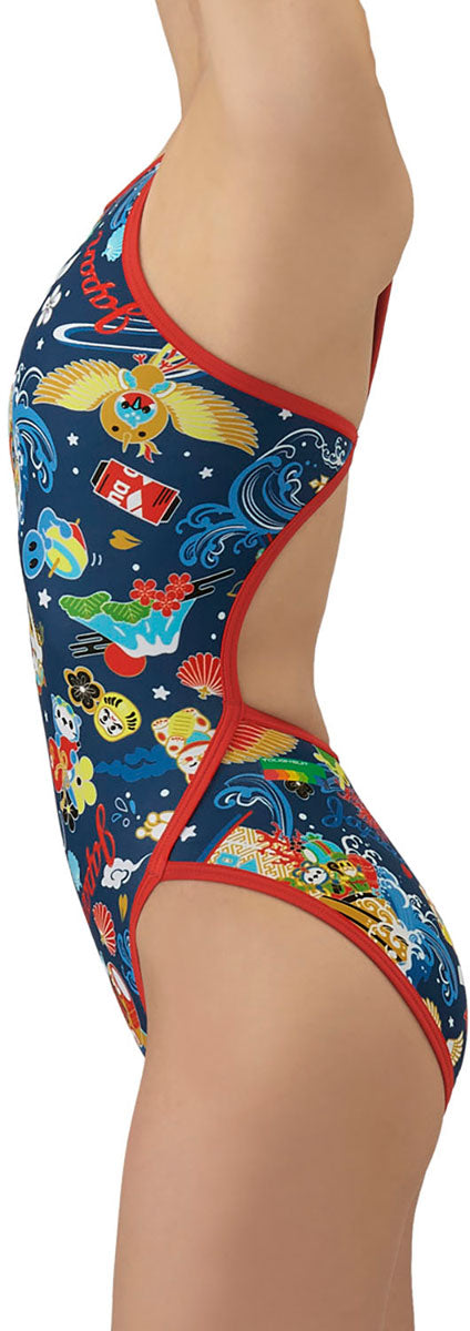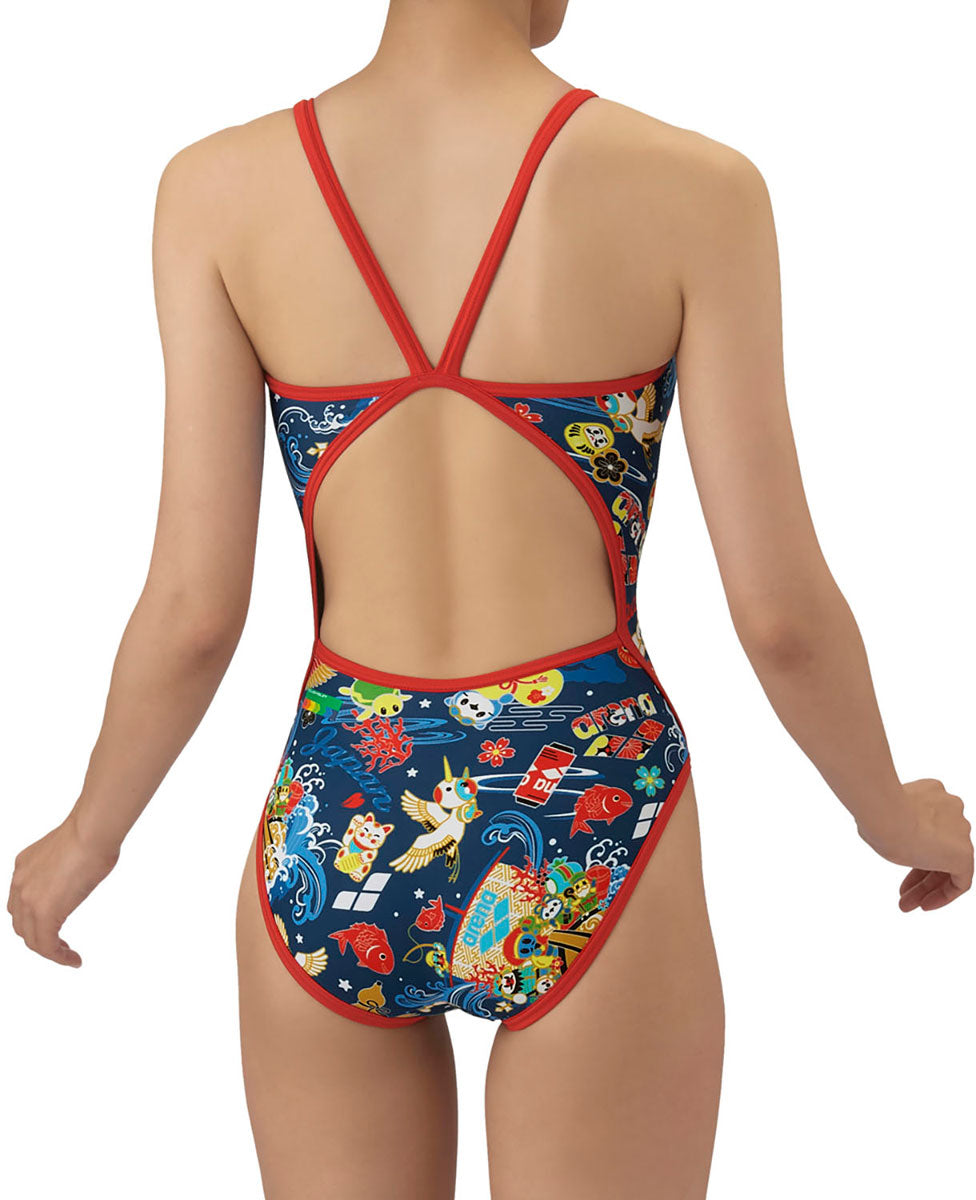 トレーニングカテゴリー「TOUGHSUITシリーズ」。大会に向けて練習を重ねる頻度が高いスイマーにオススメの練習用水着。環境に配慮したリサイクルポリエステル素材「タフスキンEP」を使用し塩素に強く長持ち。全てのスイマーに人気のアリーナくんの総柄ワンピースタイプ。日本の縁起の良い和柄と海と親和性のある宝船がポイント。宝船が象徴する繁栄や幸運が着用するスイマーたちへ届くよう願いを込めたデザイン。アリーナくんと仲間たちが七福神になっている遊び心を表現。前身頃、後身頃共に黒の裏地付き。※この商品は縫製上、一点一点プリント柄の見え方に違いが生じますので予めご了承ください。