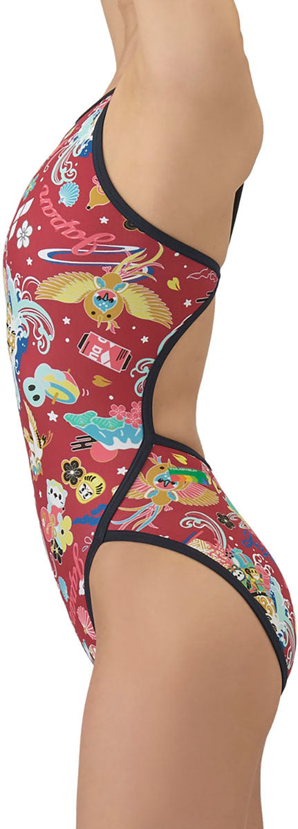 トレーニングカテゴリー「TOUGHSUITシリーズ」。大会に向けて練習を重ねる頻度が高いスイマーにオススメの練習用水着。環境に配慮したリサイクルポリエステル素材「タフスキンEP」を使用し塩素に強く長持ち。全てのスイマーに人気のアリーナくんの総柄ワンピースタイプ。日本の縁起の良い和柄と海と親和性のある宝船がポイント。宝船が象徴する繁栄や幸運が着用するスイマーたちへ届くよう願いを込めたデザイン。アリーナくんと仲間たちが七福神になっている遊び心を表現。前身頃、後身頃共に黒の裏地付き。※この商品は縫製上、一点一点プリント柄の見え方に違いが生じますので予めご了承ください。