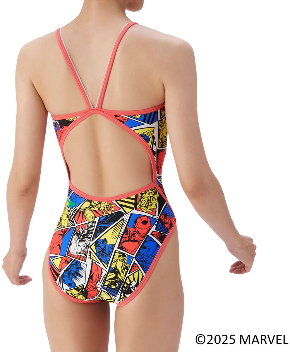 耐久性に優れたTOUGHSUIT(タフスーツ)シリーズの MARVEL(マーベル)デザインモデル。環境に配慮したリサイクルポリエステル素材を使用しており、塩素に強く長持ちするため、大会に向けて練習を重ねる頻度が高いスイマーにおすすめのトレーニング(練習)用水着。25FW は、アイアンマン/ソー/ブラック・ウィドウ/キャプテン・アメリカ/ハルク/ブラックパンサー と、MARVEL(マーベル)を代表するヒーローたちがアメリカンコミック調に表現されたプリントデザイン。ポップなカラーリングでトレーニングを楽しもう!水着とデザイン連動のメッシュキャップ(AS5FSC80U)やプルーフバッグ(AS5FBZ83U)とのコーディネートもおすすめ。※こちらの水着は、パッドが取り付けられる仕様となっておりますので、別売りひっかけパッドをご購入いただければ、パッドあり水着としてもご着用いただけます。また、この製品は縫製上、一点一点プリント柄の見え方に違いが生じますので予めご了承ください。