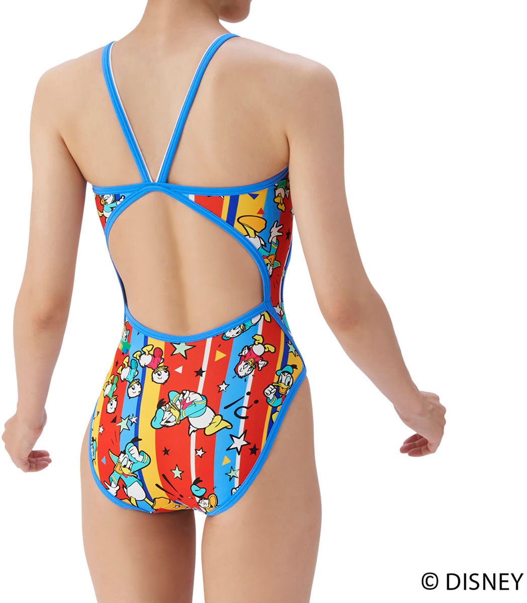 耐久性に優れたTOUGHSUIT(タフスーツ)シリーズの DisneY(ディズニー)デザインモデル。環境に配慮したリサイクルポリエステル素材を使用しており、塩素に強く長持ちするため、大会に向けて練習を重ねる頻度が高いスイマーにおすすめのトレーニング(練習)用水着。様々な表情やポーズをしたドナルド・ダックとその甥っ子たちヒューイ・デューイ・ルーイが描かれたプリントデザイン。カラフルなストライプ柄に星や記号が描かれたポップで可愛いデザインでトレーニング中の気分もアップ。水着とデザイン連動のメッシュキャップ(AS5FSC81U)やプルーフバッグ(AS5FBZ84U)とのコーディネートもおすすめ。※こちらの水着は、パッドが取り付けられる仕様となっておりますので、別売りひっかけパッドをご購入いただければ、パッドあり水着としてもご着用いただけます。また、この製品は縫製上、一点一点プリント柄の見え方に違いが生じますので予めご了承ください。