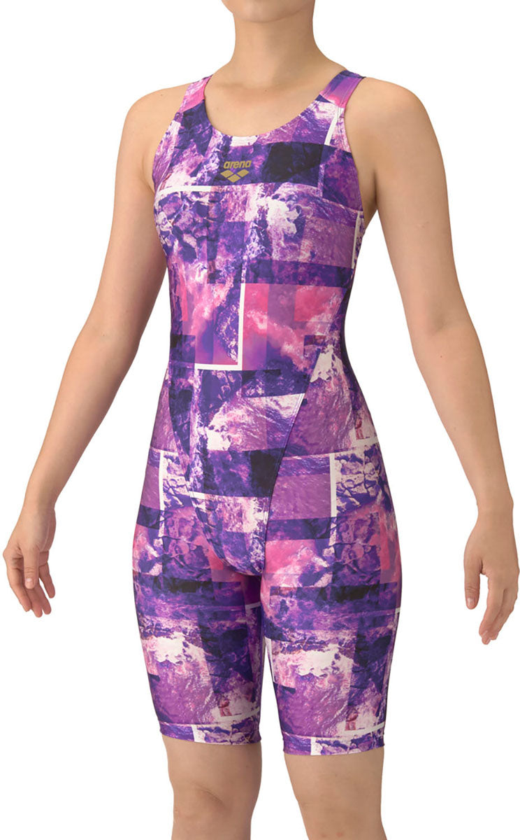 【AQUA EXA-アクアエクサ】「泳ぎやすさ」を追求したフィットネス水着、AQUA EXA(アクアエクサ)シリーズ。上達を目指すフィットネススイマーにおすすめ。あきの少ないオープンバックタイプで、背中の露出を抑えつつ、水が抜けるため泳ぎやすい。膝上まで生地があるハーフレッグ丈で、脚の露出を抑えるため、安心感を求める方におすすめ。大きく開いて着脱がしやすい「着やストラップ」搭載。はっ水生地を使用しており、シャープな水きれで軽い泳ぎ心地が特徴。パッドは「ぴったりパッド」を使用しており、水着に縫い込まれているため、水の中でもズレにくくフィット感を重視する方におすすめ。25FWアリーナシーズンテーマの WAVES(ウェ―ブス)デザイン。岩礁にぶつかる波の様子がダイナミックに描かれ、色鮮やかなカラー二ングで表現。※効果や使用感には個人差があります。また、この製品は縫製上、一点一点プリント柄の見え方に違いが生じますので予めご了承ください。