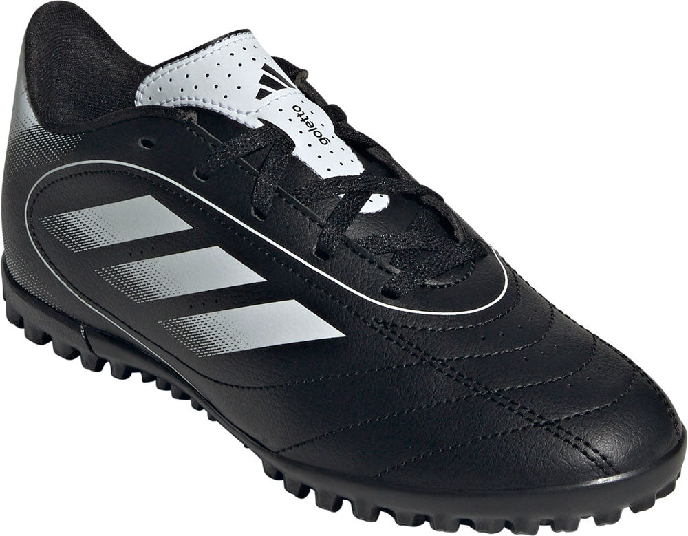 レギュラーフィット、シューレースクロージャー、合成皮革アッパー、通気性を高めるパーフォレーション、ターフ用ラバーアウトソール