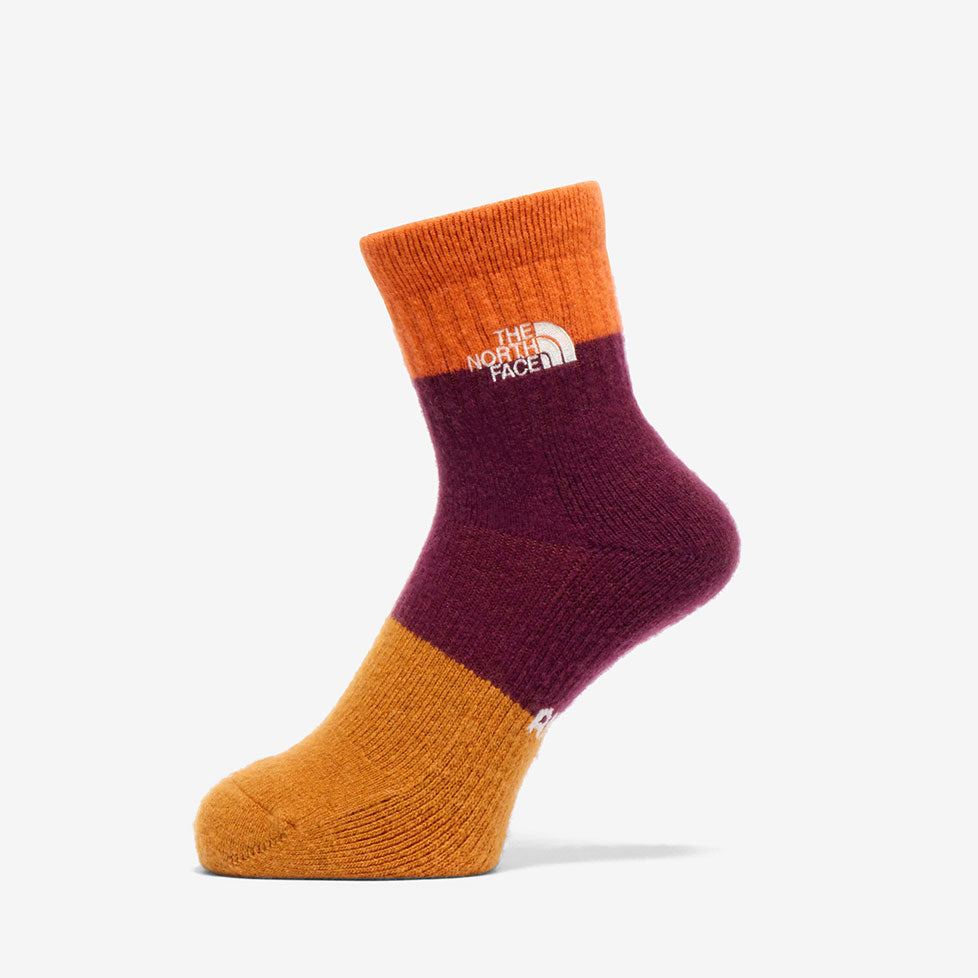 保温性と調湿性をもつウールの快適性と、摩耗強度の高いナイロンをハイブリッドした素材を採用。足裏からアキレス腱部までを保護するハーフパイル仕様で、クッション性と通気性を両立します。土踏まずのアーチサポート構造と高いフィット感のリブ設計で、長距離歩行での負担を軽減。くるぶし部で切り替えたブロックデザインで、コーディネートも楽しめます。