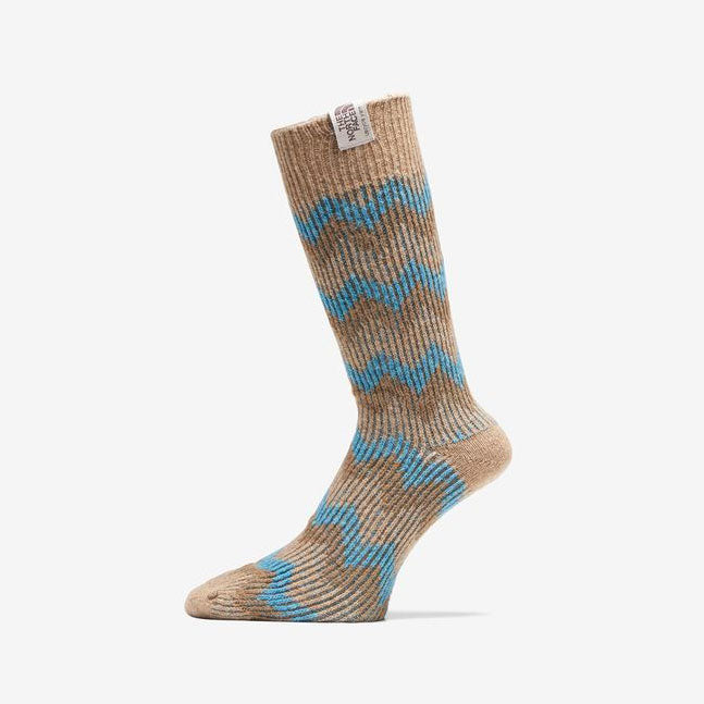 履き口には、天然素材の亜麻糸を使用した織りネームを配置。3色のウールを使用した大柄のノルディック柄で、冬の足元を暖かく彩ります。