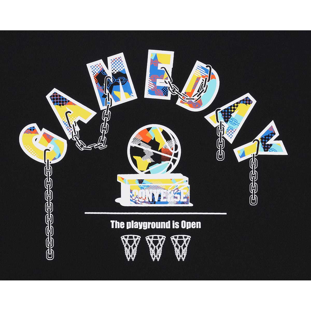 バスケットボールやシューズボックスをカラフルな幾何学模様で表現したTシャツデザイン。柔らかな肌触りに吸汗速乾を兼ね揃えたスポーツ向けアイテムです。