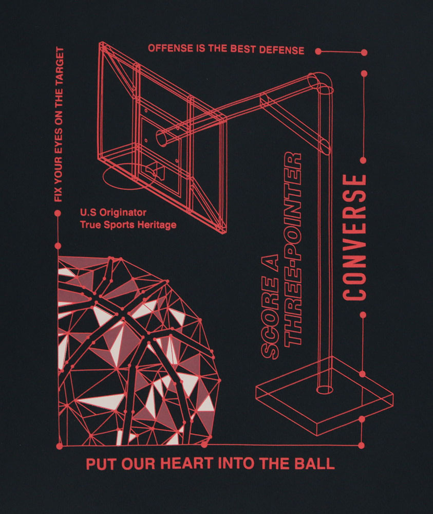 コンバースのプラクティスTシャツ。ワイヤーフレームのバスケットボールを表現したデザイン。柔らかな肌触りに吸汗速乾を兼ね揃えたスポーツ向けアイテム。