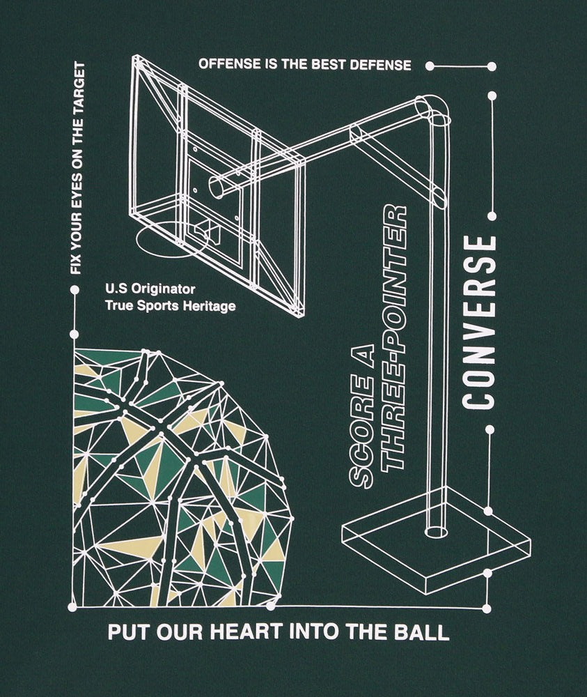 コンバースのプラクティスTシャツ。ワイヤーフレームのバスケットボールを表現したデザイン。柔らかな肌触りに吸汗速乾を兼ね揃えたスポーツ向けアイテム。