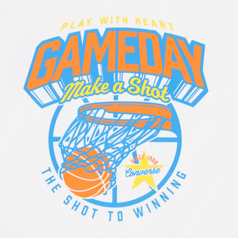 コンバースのジュニアTシャツ。カレッジロゴをイメージするグラフィック。柔らかな肌触りに吸汗速乾を兼ね揃えたスポーツ向けアイテム。