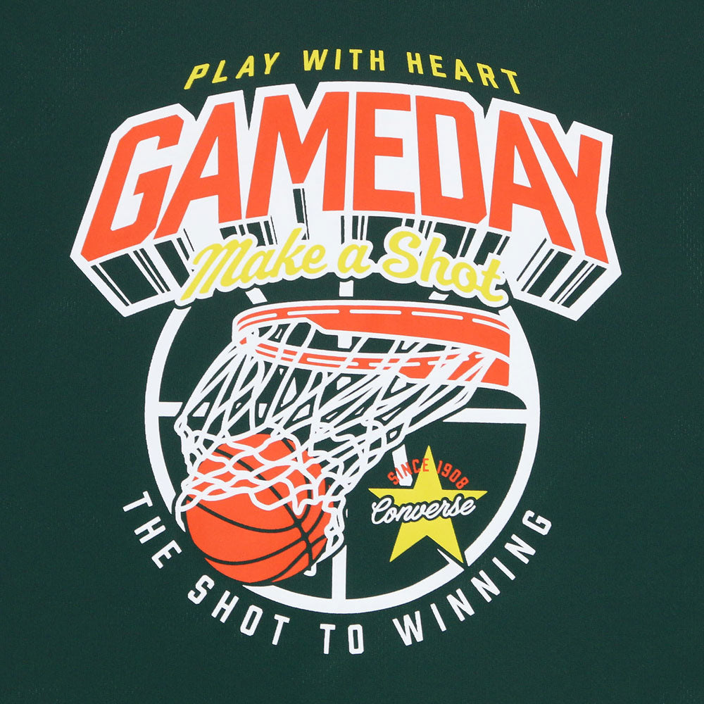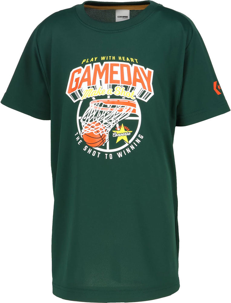 コンバースのジュニアTシャツ。カレッジロゴをイメージするグラフィック。柔らかな肌触りに吸汗速乾を兼ね揃えたスポーツ向けアイテム。