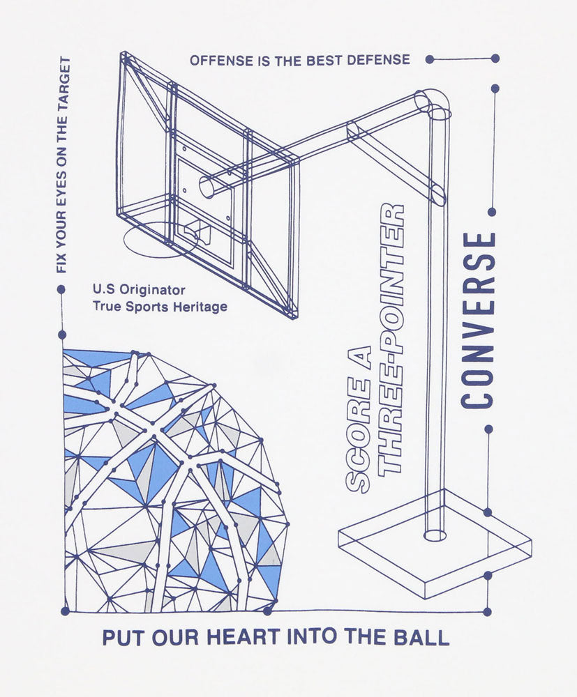 コンバースのジュニアTシャツ。ワイヤーフレームのバスケットボールを表現したデザイン。柔らかな肌触りに吸汗速乾を兼ね揃えたスポーツ向けアイテム。