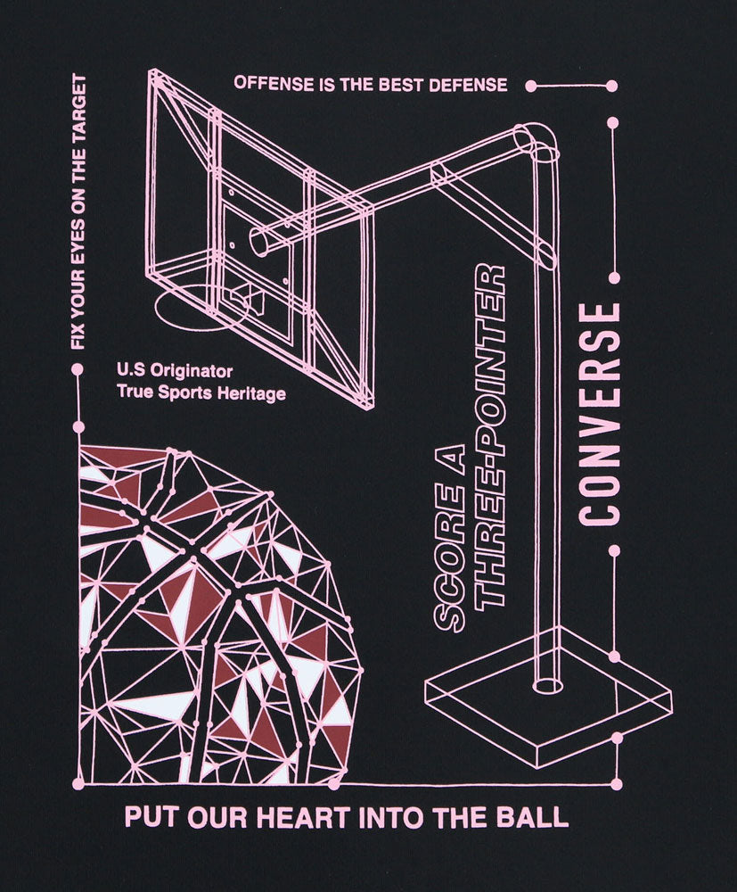 コンバースのジュニアTシャツ。ワイヤーフレームのバスケットボールを表現したデザイン。柔らかな肌触りに吸汗速乾を兼ね揃えたスポーツ向けアイテム。