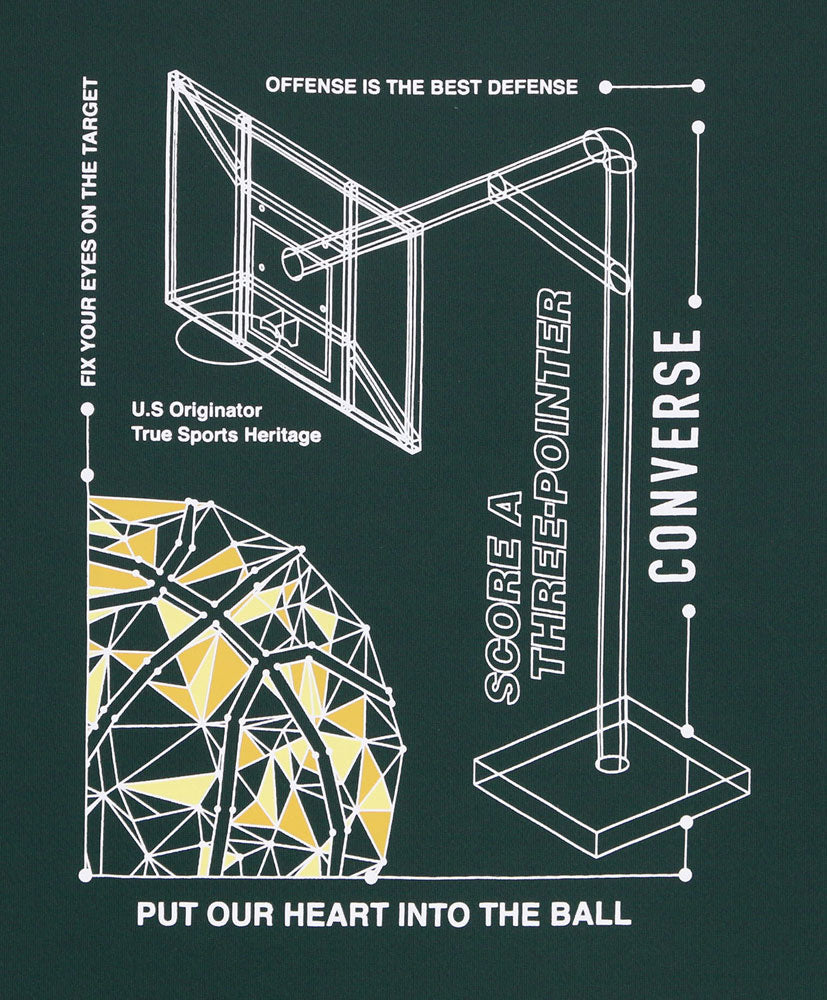 コンバースのジュニアTシャツ。ワイヤーフレームのバスケットボールを表現したデザイン。柔らかな肌触りに吸汗速乾を兼ね揃えたスポーツ向けアイテム。
