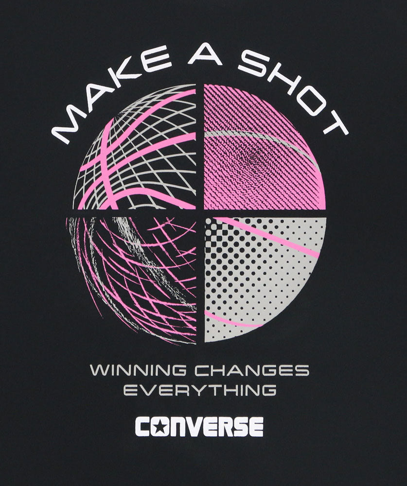 コンバースのジュニアTシャツ。バスケットボールをグラフィカルに表現したデザイン。柔らかな肌触りに吸汗速乾を兼ね揃えたスポーツ向けアイテム。