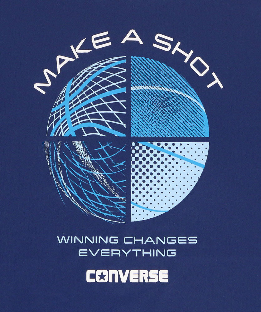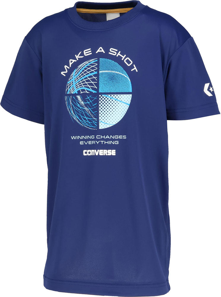 コンバースのジュニアTシャツ。バスケットボールをグラフィカルに表現したデザイン。柔らかな肌触りに吸汗速乾を兼ね揃えたスポーツ向けアイテム。