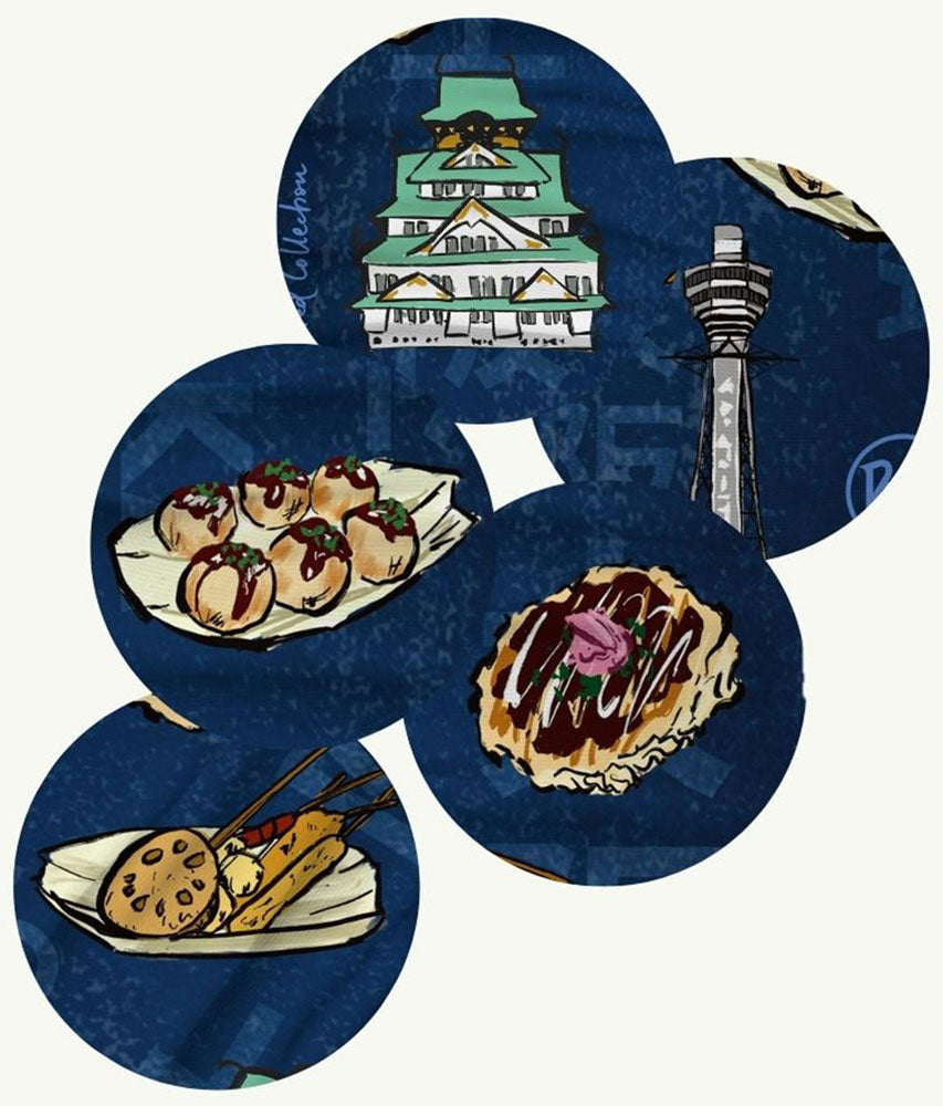 The motifs are Osaka specialties such as Tsutenkaku, Osaka Castle, takoyaki, okonomiyaki, and kushiage! The letters "Osaka" and "OSAKA" are designed on a blue background.