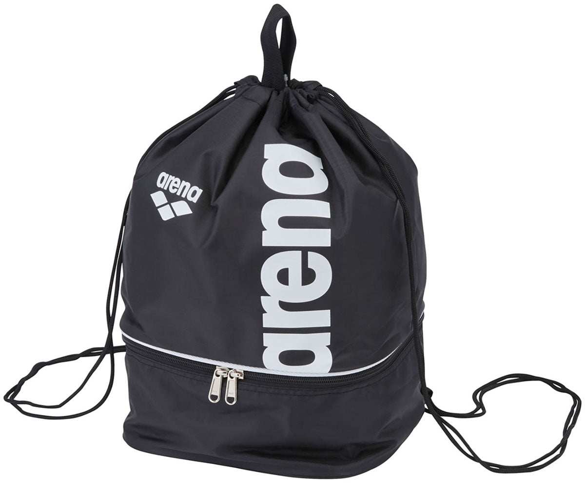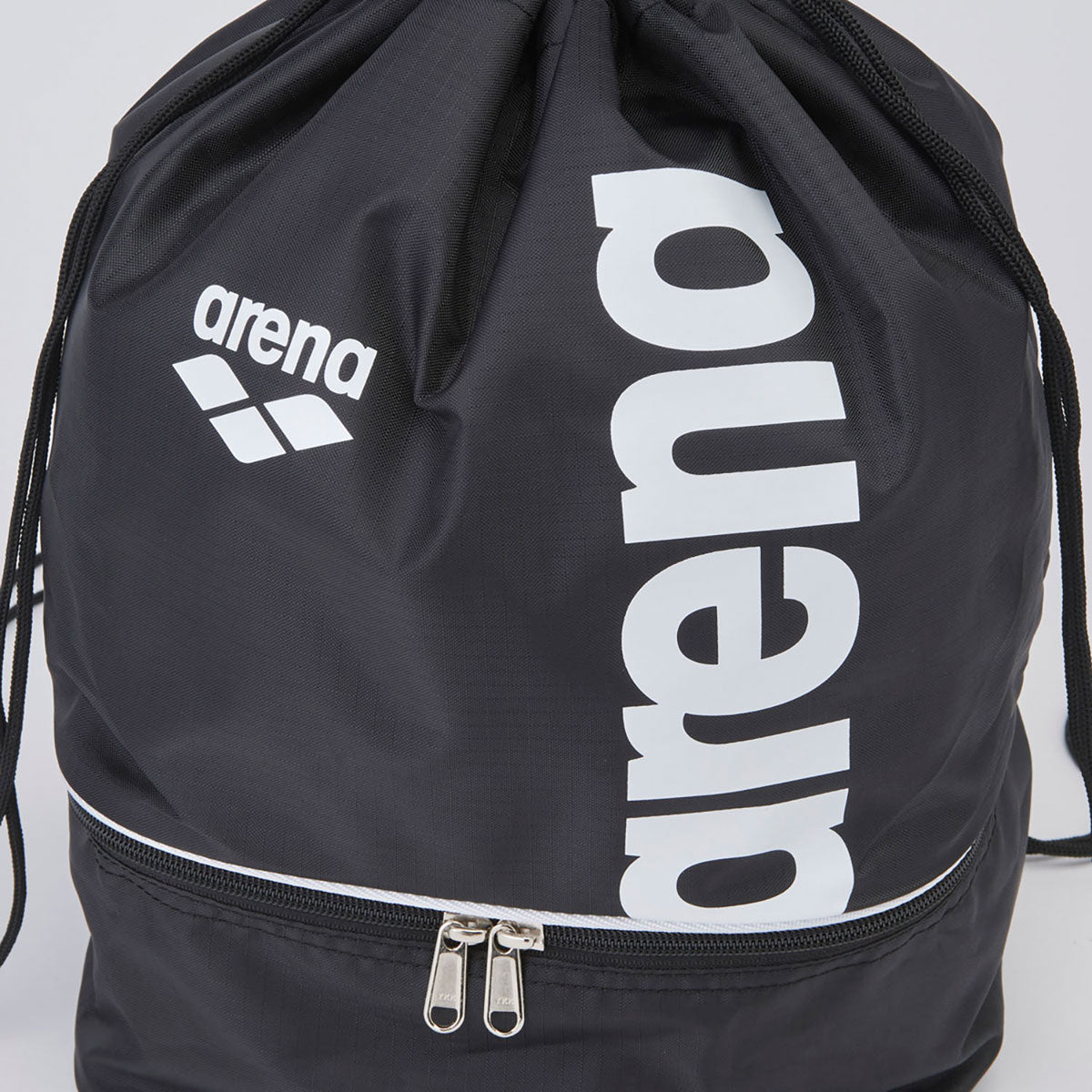 arenaロゴをスポーティにアレンジした2ルーム仕様のプールバッグ。 2ルーム仕様のため、持ち運びに困るサンダルを底部ルームに収納可能。またナップサック仕様なので、お子さんのスイミングスクールやプールの授業におススメ。