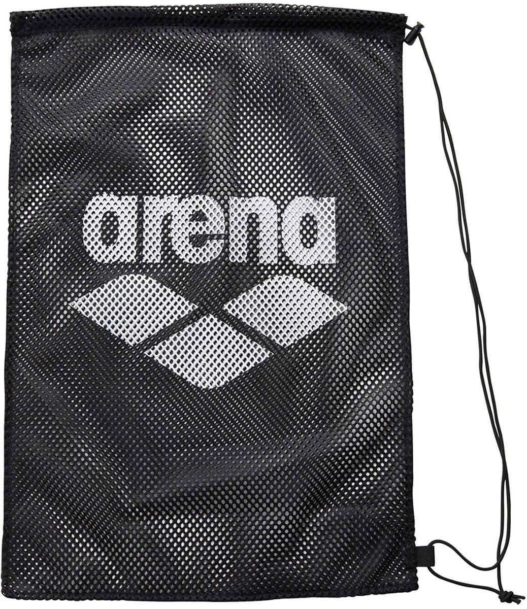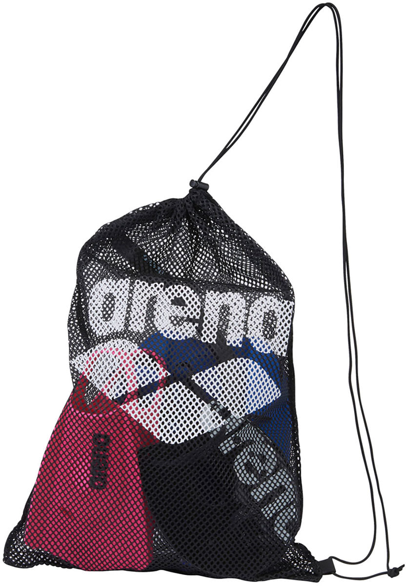 水はけの良いメッシュ素材のメッシュバッグ。メッシュ素材を使用しているので、ビート板・フィン・パドル・シュノーケルなどの濡れるトレーニングツールを収納するのにおススメ。arenaロゴを全面に大きく抑えたインパクトのあるデザイン。