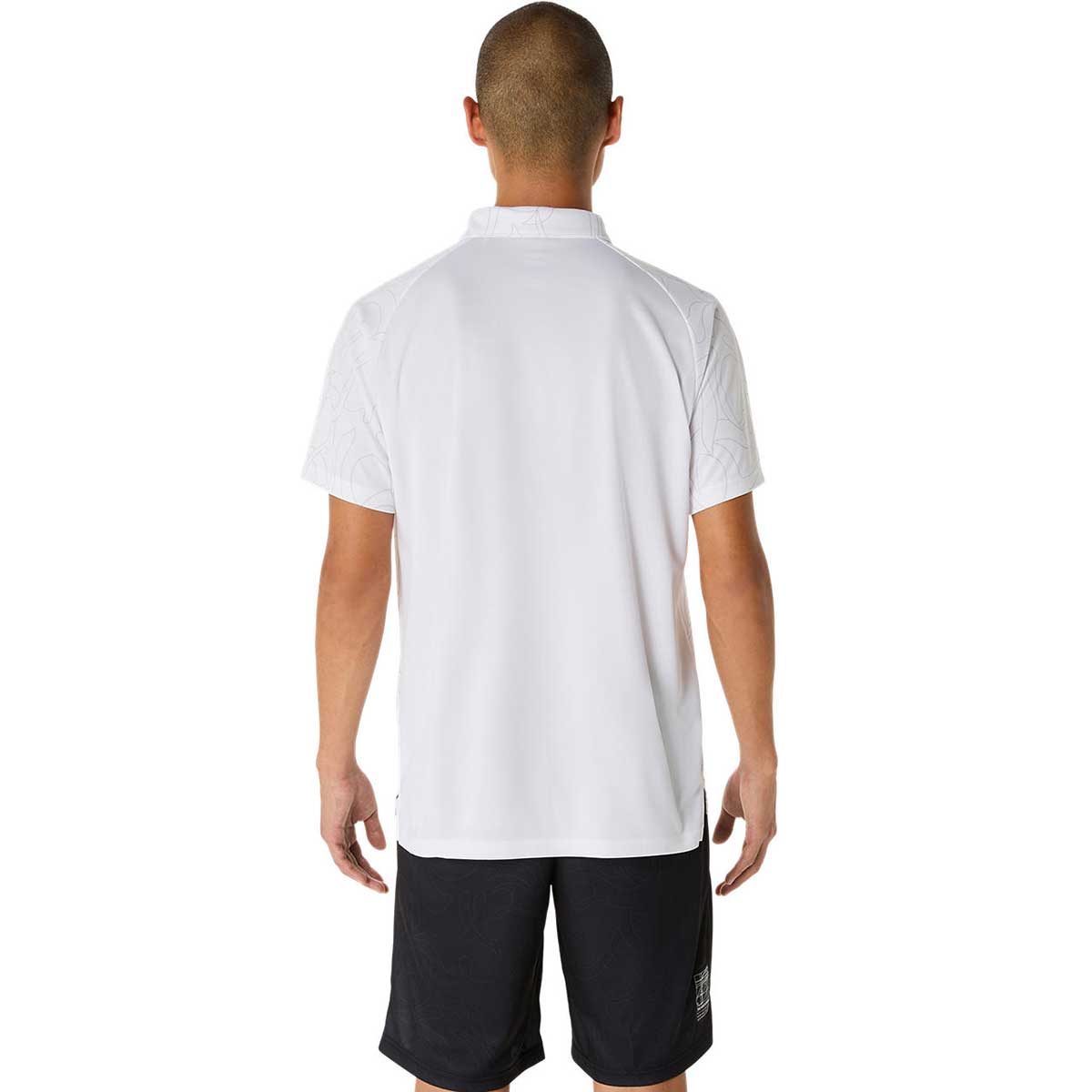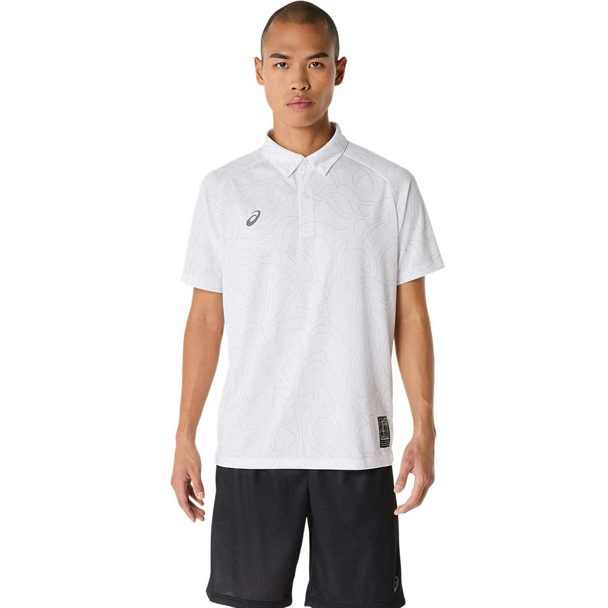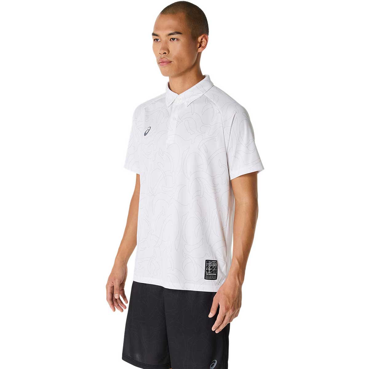 ・コンセプトであるジャポニズムの昇華グラフィックをフロントと両袖に採用・ひとつのデザインパターンから複数の型取りによって作成された世界で唯一のアイテム・襟の型崩れに配慮して襟ボタンを採用・吸汗速乾性を追求したポリエステルニット素材を採用・アシックススパイラルウーブンラベルをデザインのアクセントに・主素材の50%以上にリサイクル素材を使用