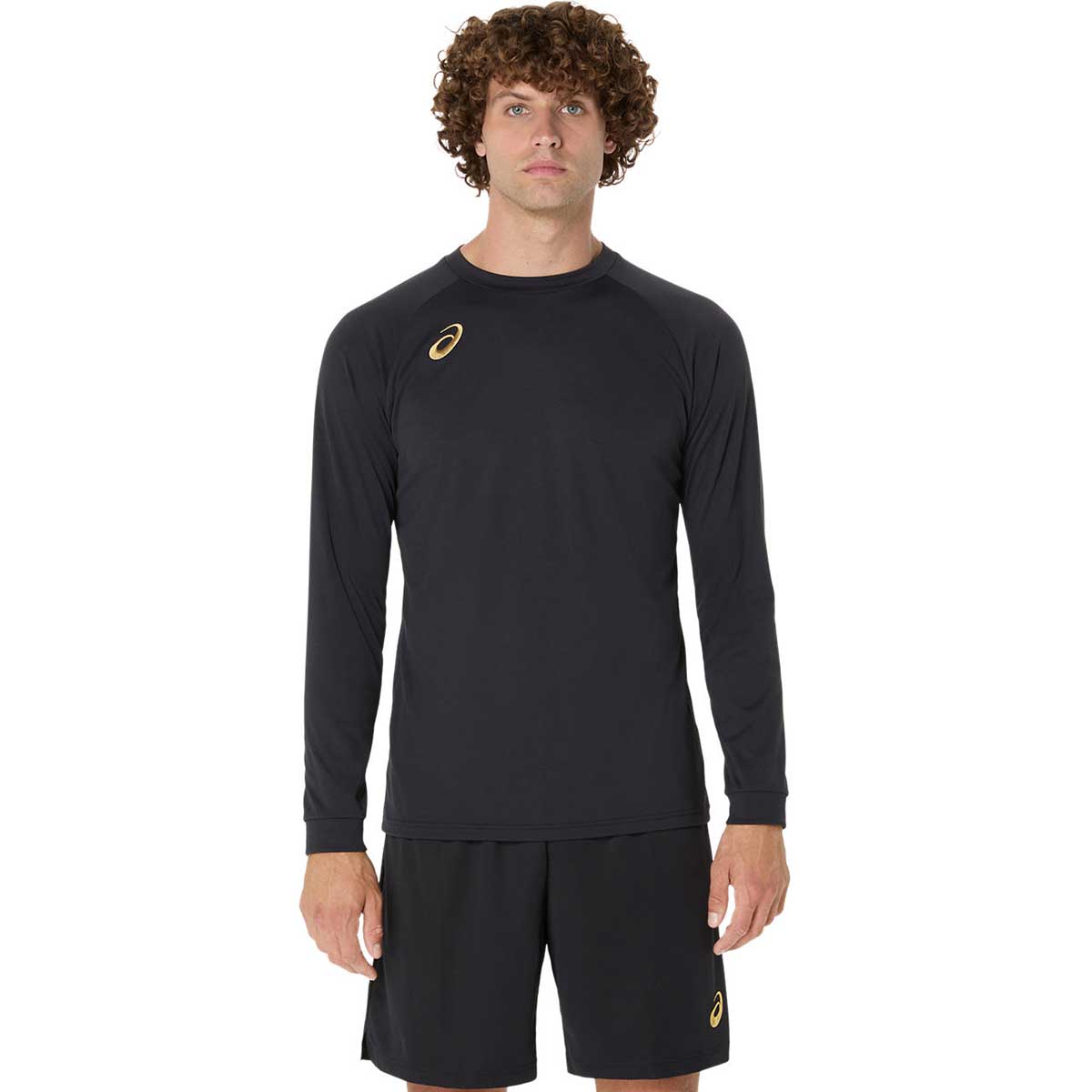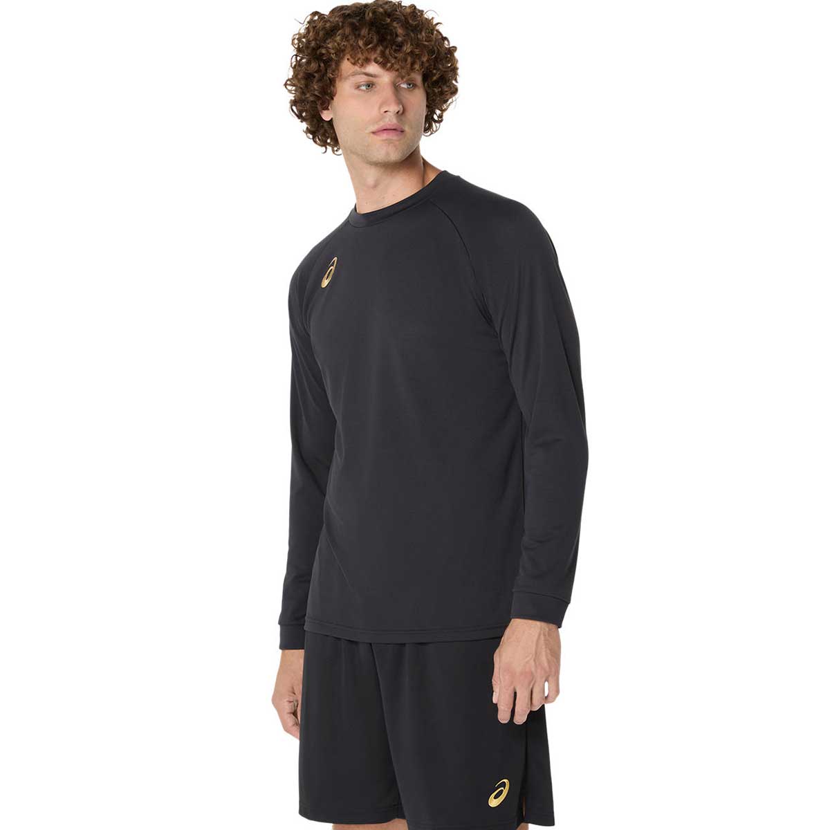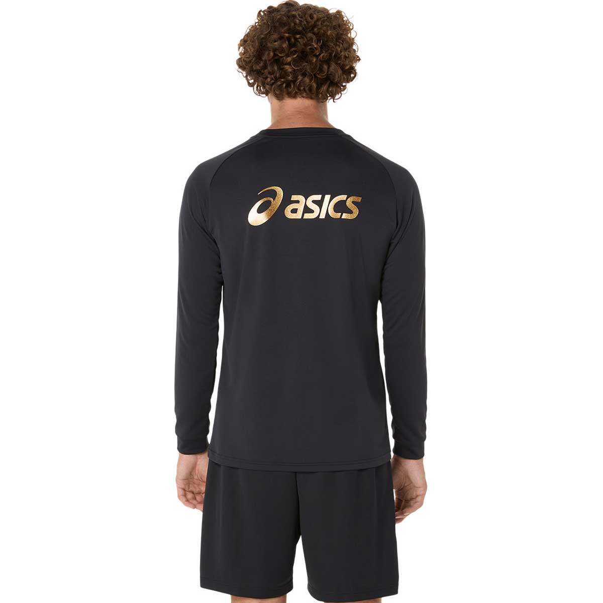 右胸のマークは刺繍、背面に大きめのアシックスロゴをラメプリントで表現した長袖シャツ