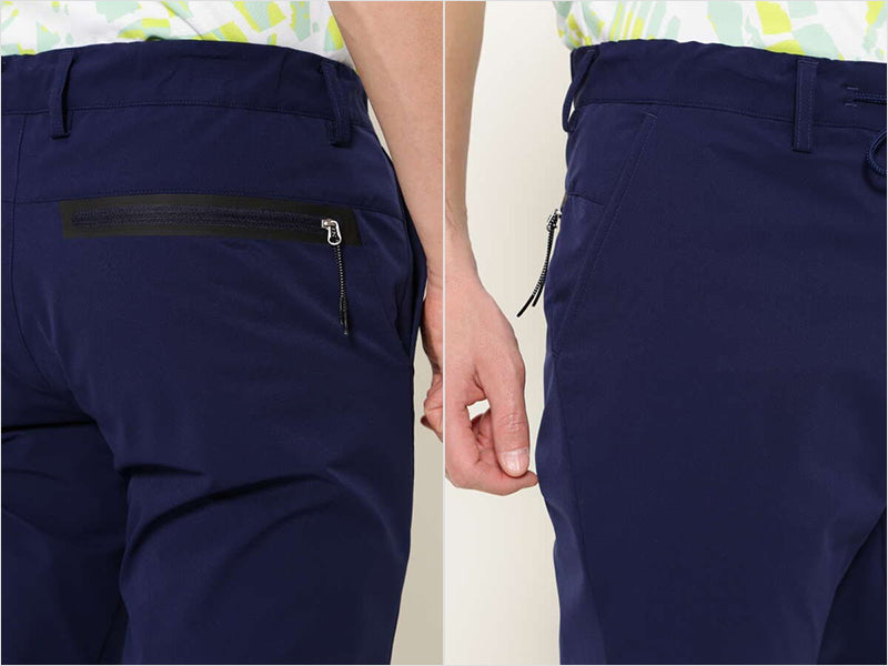 アウトドアな要素をデザインに取り入れたテーパードパンツ。8wayストレッチで全方向に動く快適なこの素材は、肌面を凹凸のある組織にし、サラサラとした肌触りも特徴です。内ウエストにジャカードゴムを施し、内側のデザインにも気を使ったアイテムです。ひざ裏のシームが足長効果に見える位置に施されています。リラックス感のある履き心地とシルエットでゴルフプレーでの着用はもちろんのこと、アウトドアやレジャーなど幅広く活躍するパンツに仕上がっています。