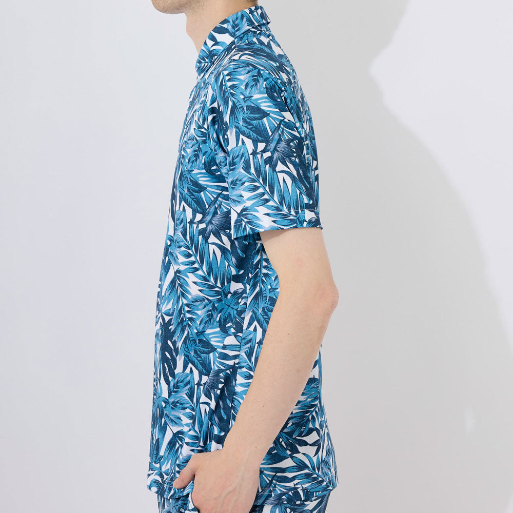 表面には遮熱性機能を、肌面には接触冷感機能を備えたひんやり素材のボタニカル柄半袖シャツです。