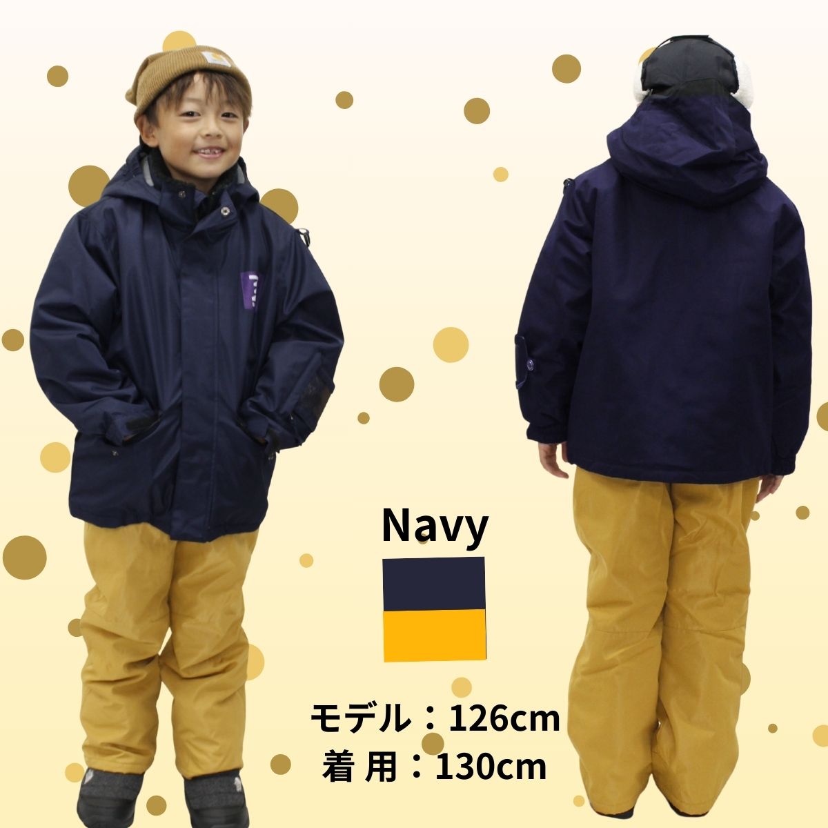 ジャケット、パンツともにサイズ調整機能付き。お子様の成長に合わせて最大20cmの