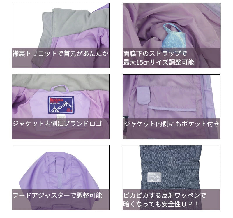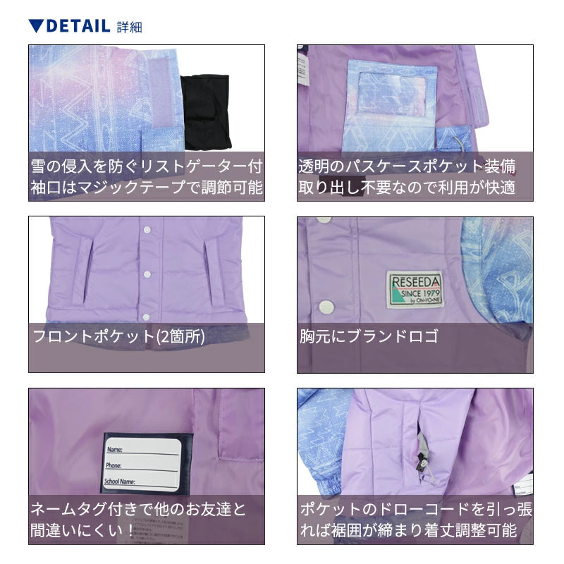 ベストオンタイプのデザインで大人カワイイ一着。左裾には収納可能なパスケース付きでスキー場でも安心。お子様の安全に考慮し、新JIS規格に対応して作られています。安心便利な機能を標準装備しているRESEEDA仕様です。