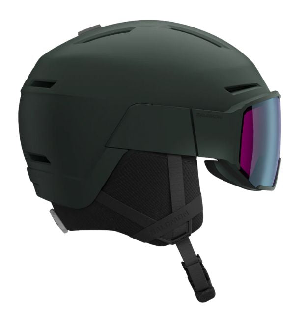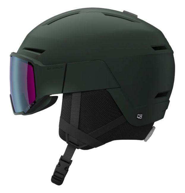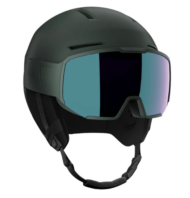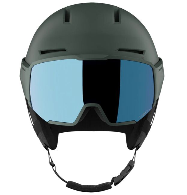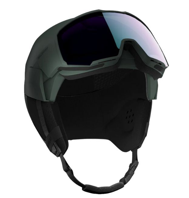 Salomon の薄型 Osmo SIGMA™ バイザーヘルメット。EPS、PC シェル、ストラップなど、一部にリサイクル素材を使用したこの一体型モデルは、色のコントラストを高める SIGMA™ バイザーと、ヘルメットのフィット感を簡単に微調整できる Custom Dial V を装備し、眼鏡をかけたままでも装着可能です。