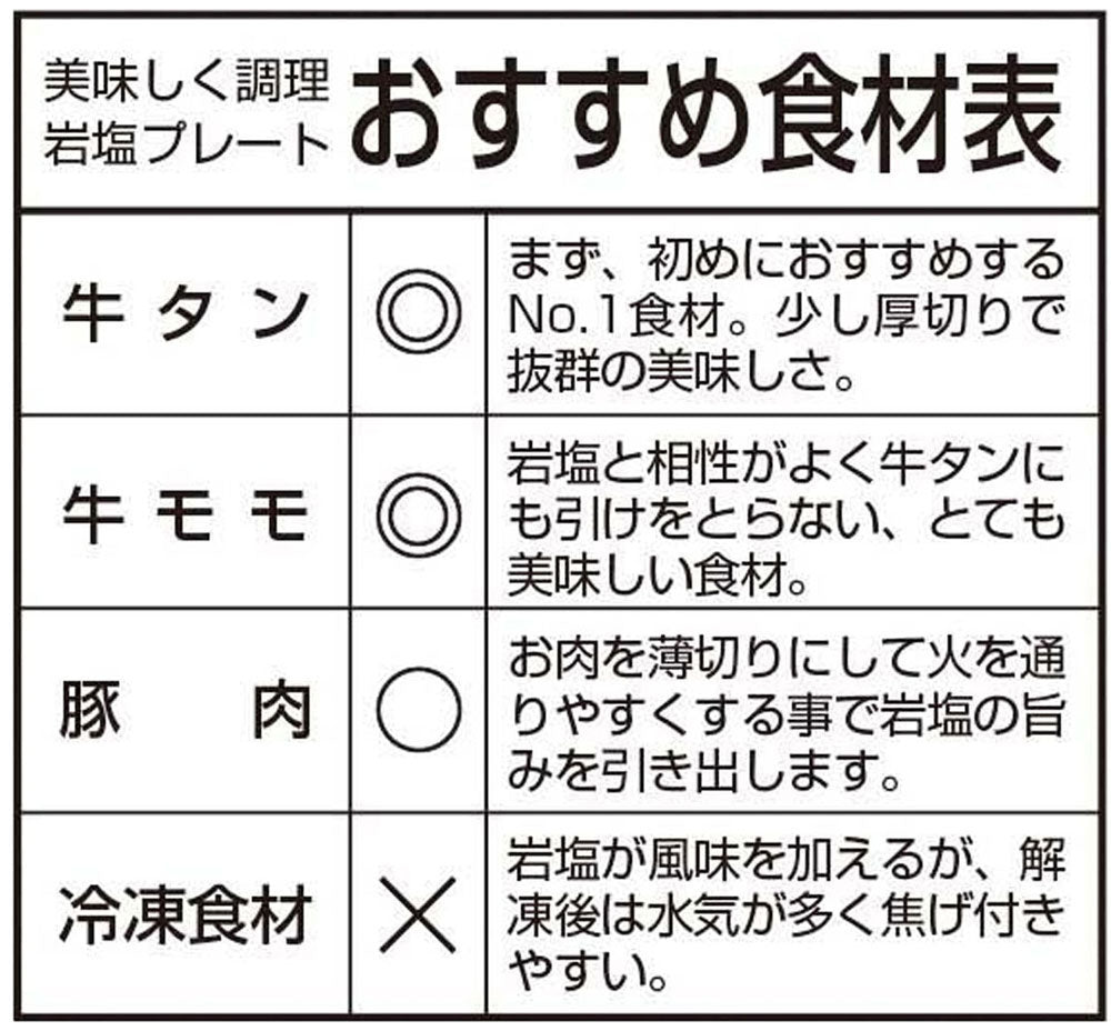 美味しさを引き立たせる、ヒマラヤ産天然岩塩です。岩塩プレートの良質な塩分が程よく食材に吸収されて塩味を付けます。(製品の特性上、お届け時に割れが生じている場合もございます。使用上問題はございませんので予めご了承ください。)サイズ(約):155×100×厚さ25mm/重量(約):870g材質:ヒマラヤ産岩塩原産国:パキスタン【岩塩プレートの効果】(1)熱を加えられ加熱した岩塩プレートから遠赤外線効果を発生してじっくりと食材の芯まで通ります。(2)岩塩はミネラルが豊富な上に、余分な水分を吸収するので海鮮や野菜などが、美味しく仕上がります。(3)プレートの上に載せたお肉の余分な油を岩塩が吸収してくれるので仕上がりはとてもヘルシーです。【使用方法】焼きアミ上に岩塩プレートを置きます。コンロや七輪等を熱し、プレート全体に熱が回ったらプレートの上に食材を載せて焼き上げます。お好みの火加減でお楽しみ下さい。また、岩塩プレートの焦げ付きが酷くなってきたら、裏返して引き続きご使用ください。※水気の多い食材は、岩塩が溶け出し焦げ付きやすくなります。焦げ付いた場合はプレートを裏返してお使いください。両面が焦げ付いた場合は、ナイフ等で焦げをやわらかく削り取ってから再度お使いください。指や手等を切らないように十分ご注意ください。