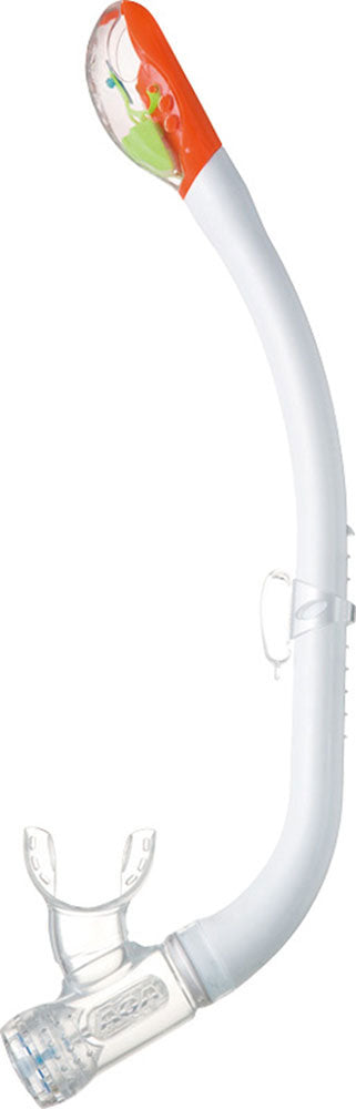 水の侵入を自動的に防ぐドライトップバルブ機能付きスノーケル。男女兼用レギュラーサイズ。プラスチックパイプ / エラストマー製マウスピースサイズ:全長 /390 mm / 内容積 110 cc / 内径 17 mm相当パッケージサイズ: 435 mm× 140 mm