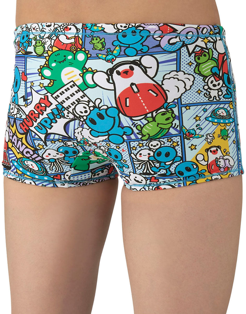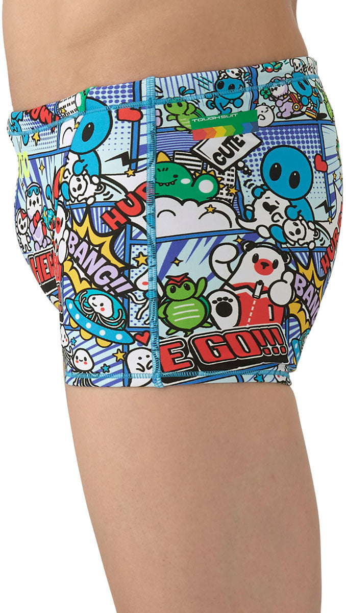 トレーニングカテゴリー「TOUGHSUITシリーズ」。大会に向けて練習を重ねる頻度が高いスイマーにオススメの練習用水着。環境に配慮したリサイクルポリエステル素材「タフスキンEP」を使用し塩素に強く長持ち。全てのスイマーに人気のアリーナくんの総柄ショートレッグタイプ。AS5FWM01Mで展開するテーマ(宇宙や地球)と連動する冒険物語。アメリカンコミック調の柄は鮮やかな色合いとダイナミックな線が特徴でインパクトのあるデザイン。アリーナくんたちと地球外生命体(怪獣、宇宙人、お化け)が出会い、友達になる過程をプリントに表現。地球を守る戦隊ヒーロー風のスタイルを取り入れることで、アリーナくんたちのチームとしての一体感を演出。カラフルな4配色の展開。前身頃、後身頃共に黒の裏地付き。※この商品は縫製上、一点一点プリント柄の見え方に違いが生じますので予めご了承ください。