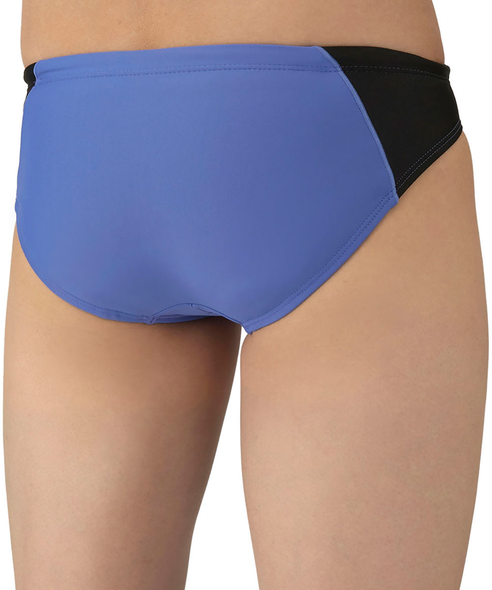 スポーティーでありながらファッション性の高いアシンメトリーの切替えと、シンプルながら洗練されたデザインのブリーフタイプ。レトロな配色を採用。前後に黒の裏地付き。