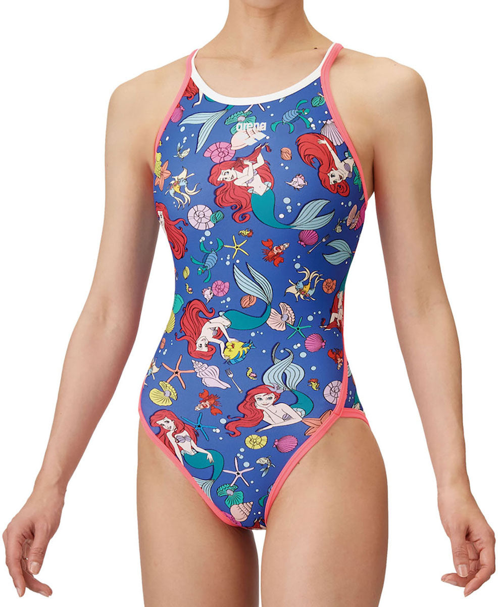 耐久性に優れた TOUGHSUIT(タフスーツ)シリーズの Disney(ディズニー)デザインモデル。環境に配慮したリサイクルポリエステル素材を使用しており、塩素に強く長持ちするため、大会に向けて練習を重ねる頻度が高いスイマーにおすすめのトレーニング(練習)用水着。映画『リトル・マーメイド』に登場するプリンセス ”アリエル” が海の中で友達の ”フランダ―” と一緒に遊ぶ様子が描かれたデザイン。貝殻やヒトデなど、海を連想するモチーフを色鮮やかなカラーリングで可愛く表現。”アリエル” たちと一緒に気分を上げて、プールで泳ごう!水着のデザインとお揃いのメッシュキャップ(AS5SSC82U)やプルーフバッグ(AS5SBZ85U)との組み合わせもおすすめ。※この製品は縫製上、一点一点プリント柄の見え方に違いが生じますので予めご了承ください。